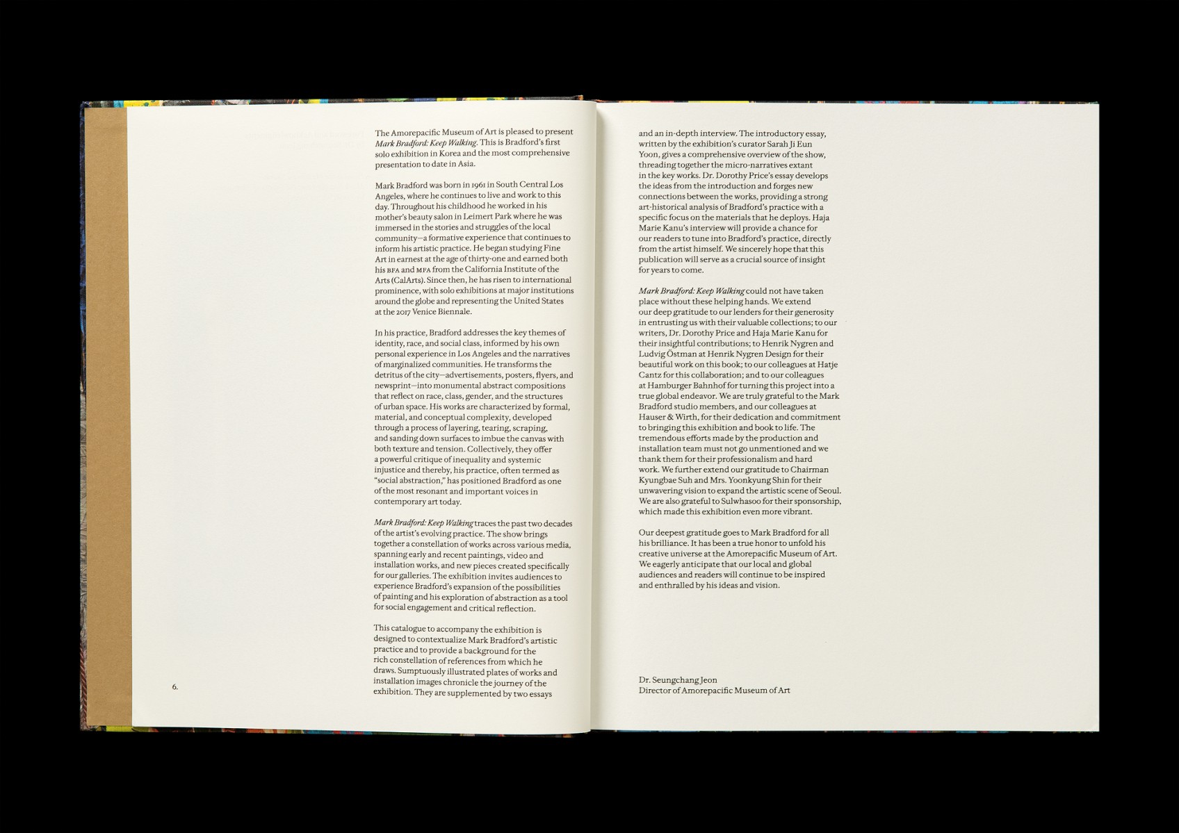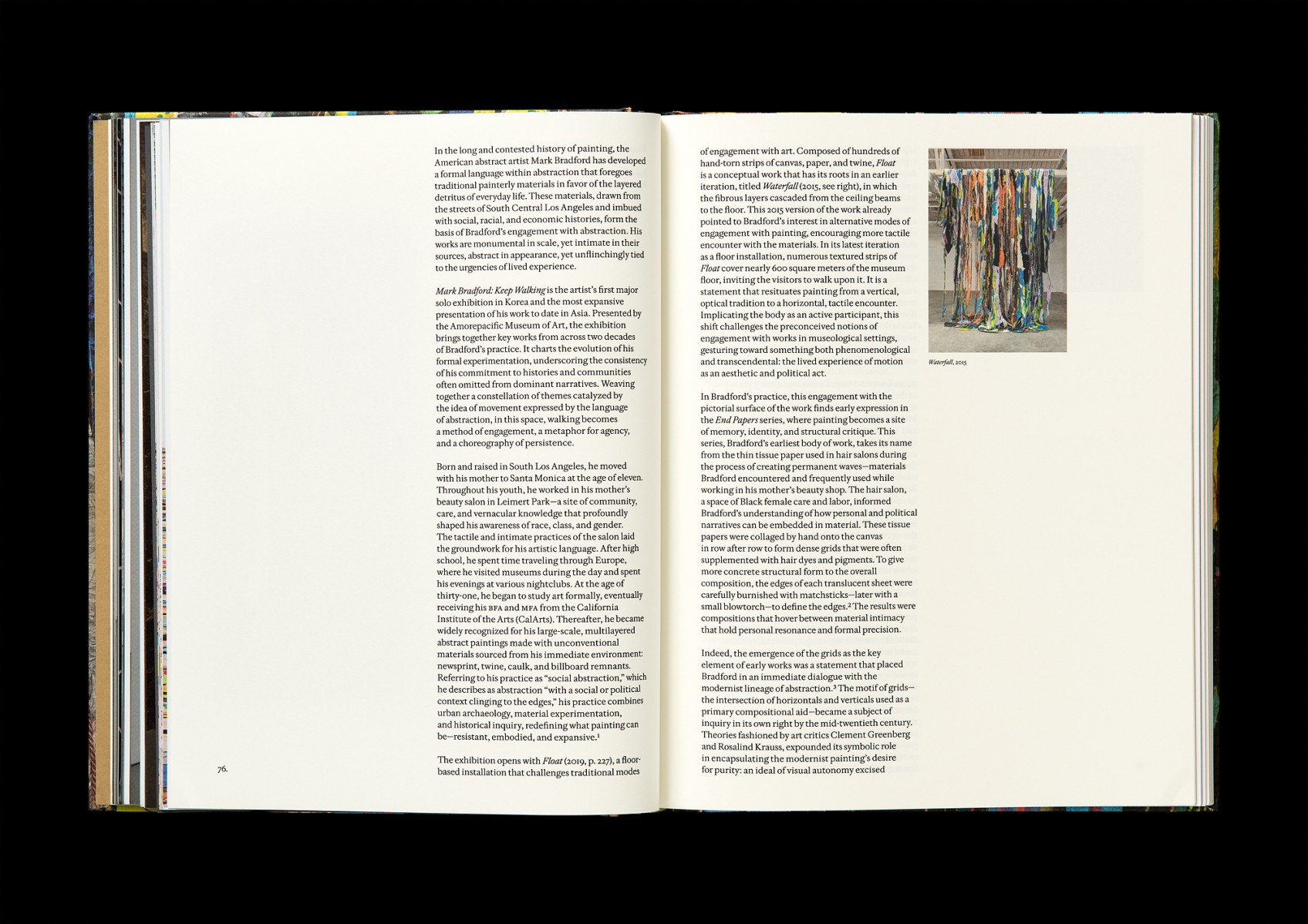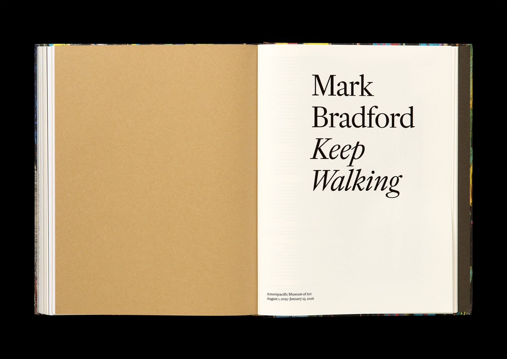 The book Mark Bradford: Keep Walking, commissioned by the Amorepacific Museum of Art (APMA), in conjunction with Mark Bradford’s first solo exhibition in Korea. Keep Walking toured from Hamburger Bahnhof in Berlin and opened at APMA in September 2025. Produced in collaboration with Hauser & Wirth (USA). Distributed by Hatje Cantz Verlag (Germany).