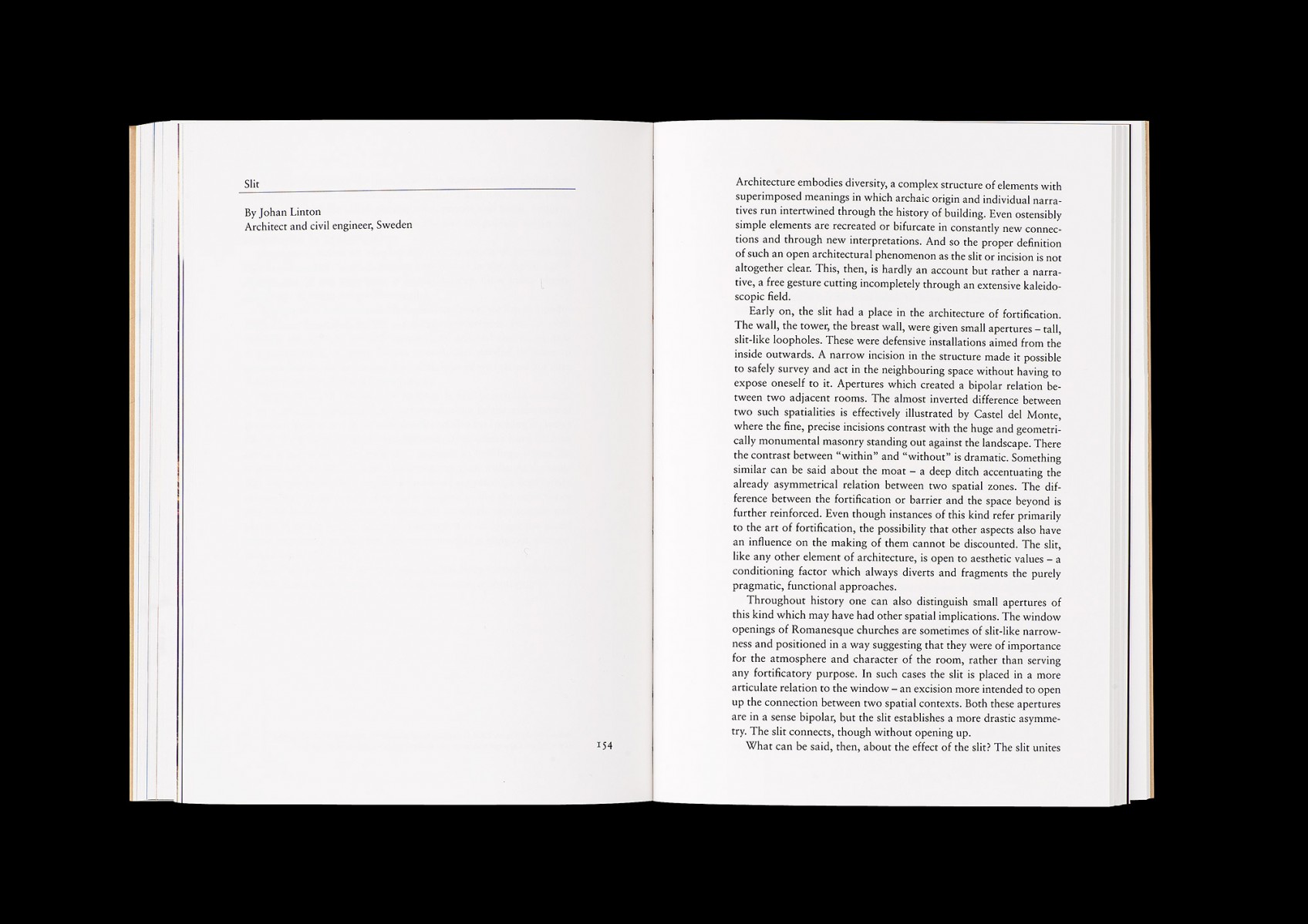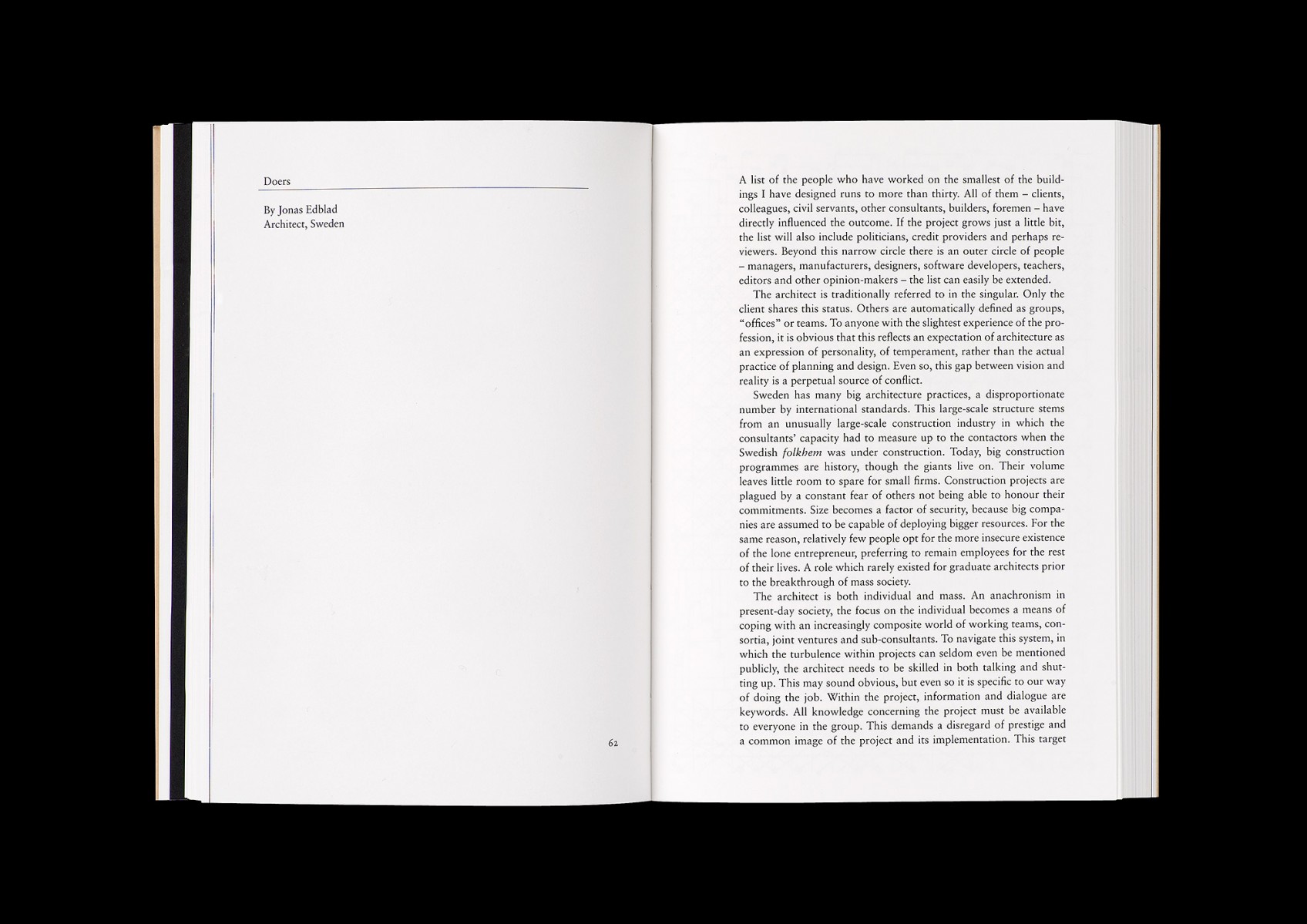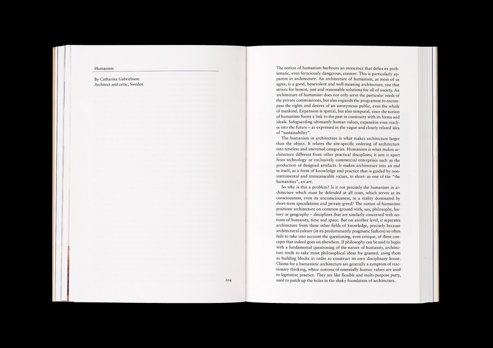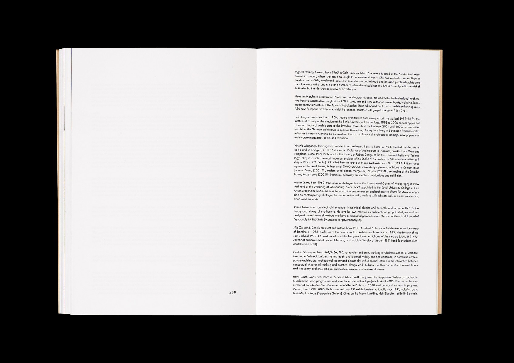 Editors: Gert Wingårdh and Rasmus Wærn. Texts by Massimiliano Fuksas, Denise Scott Brown, Peter Blundell Jones, Orhan Pamuk et al. Photographs and art by Giorgio De Chirico, Andreas Gursky, Philip Johnson, Marcus Larsson, Esko Männikkö, Georg Stubbs och Bill Viola et al.