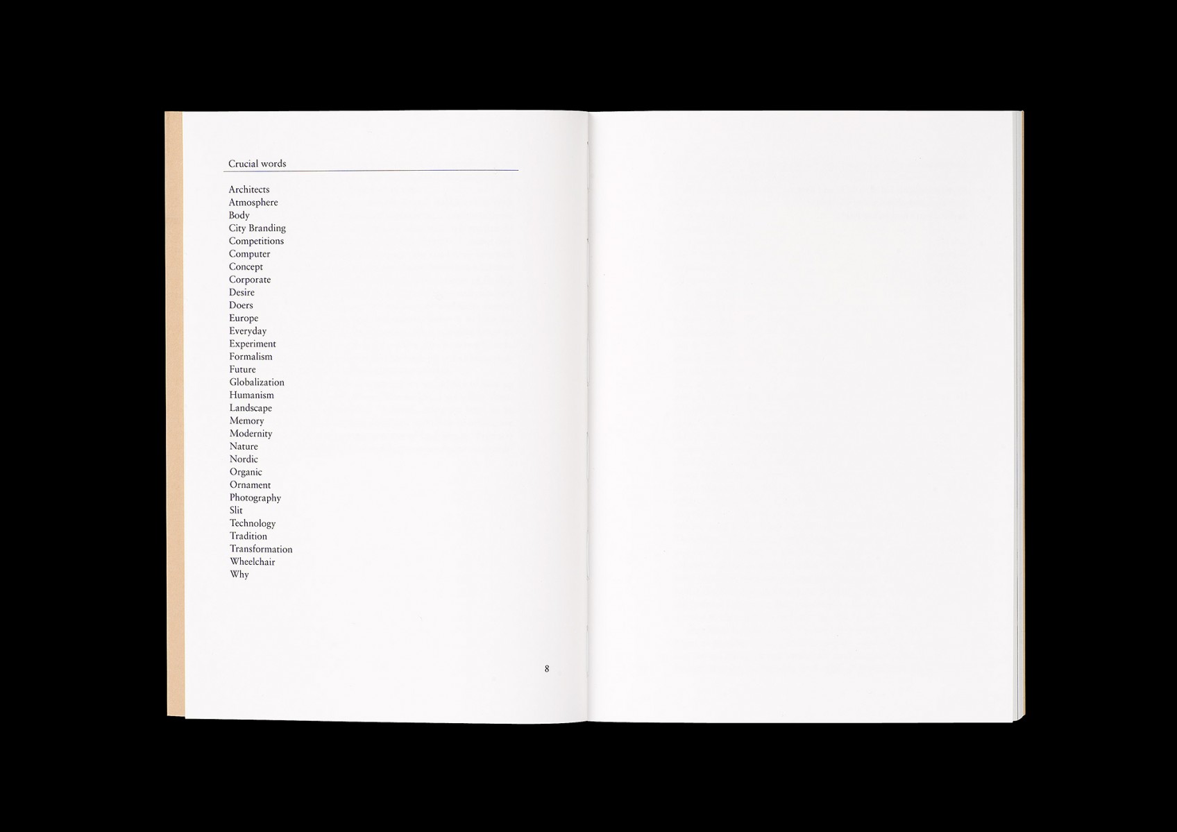 Book for Birkhäuser Verlag (Switzerland): Crucial Words, in connection with the exhibition Eight Houses on Gert Wingårdh at the Gothenburg Röhsska Museum in 2008 (see Röhsska Museum).