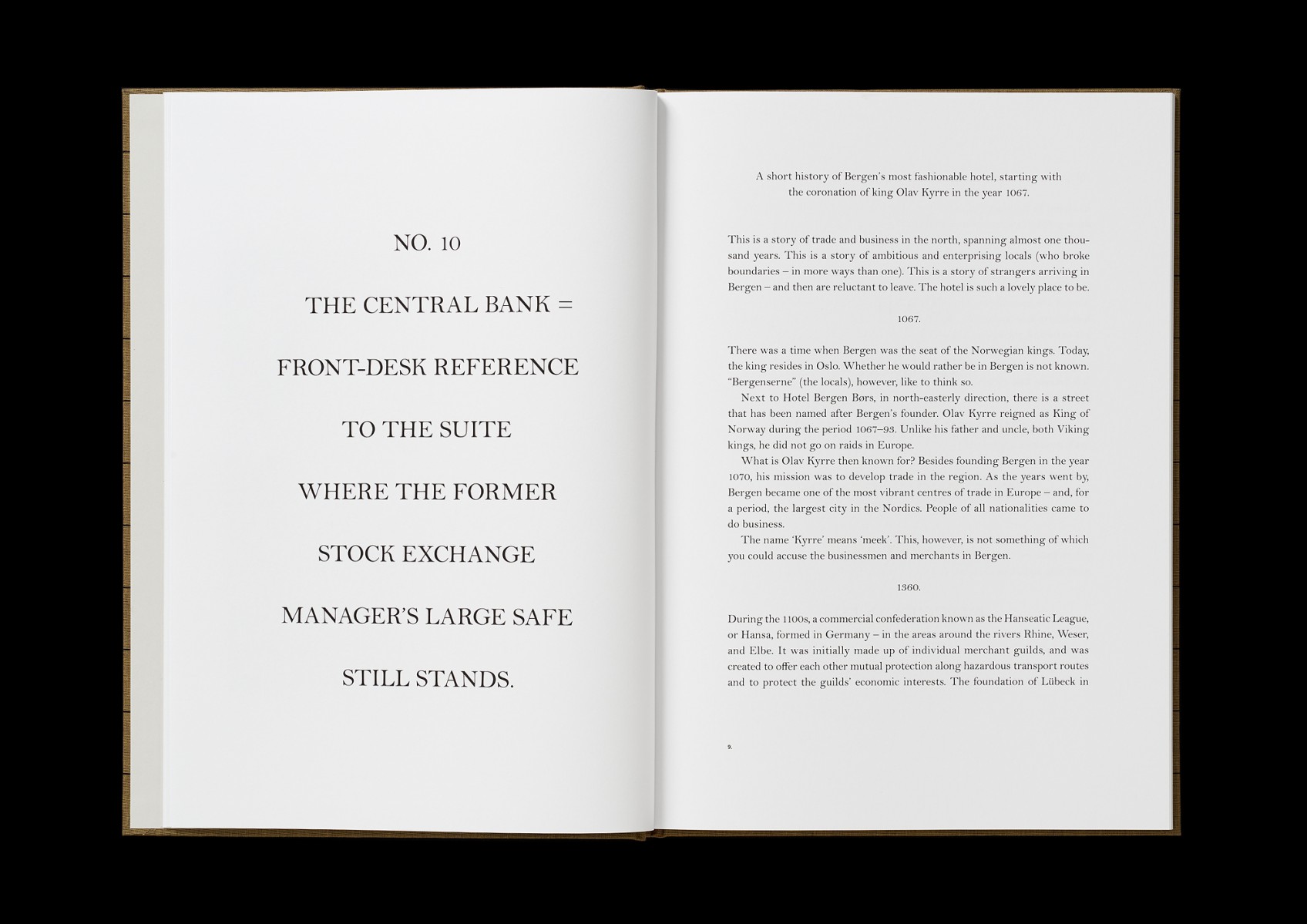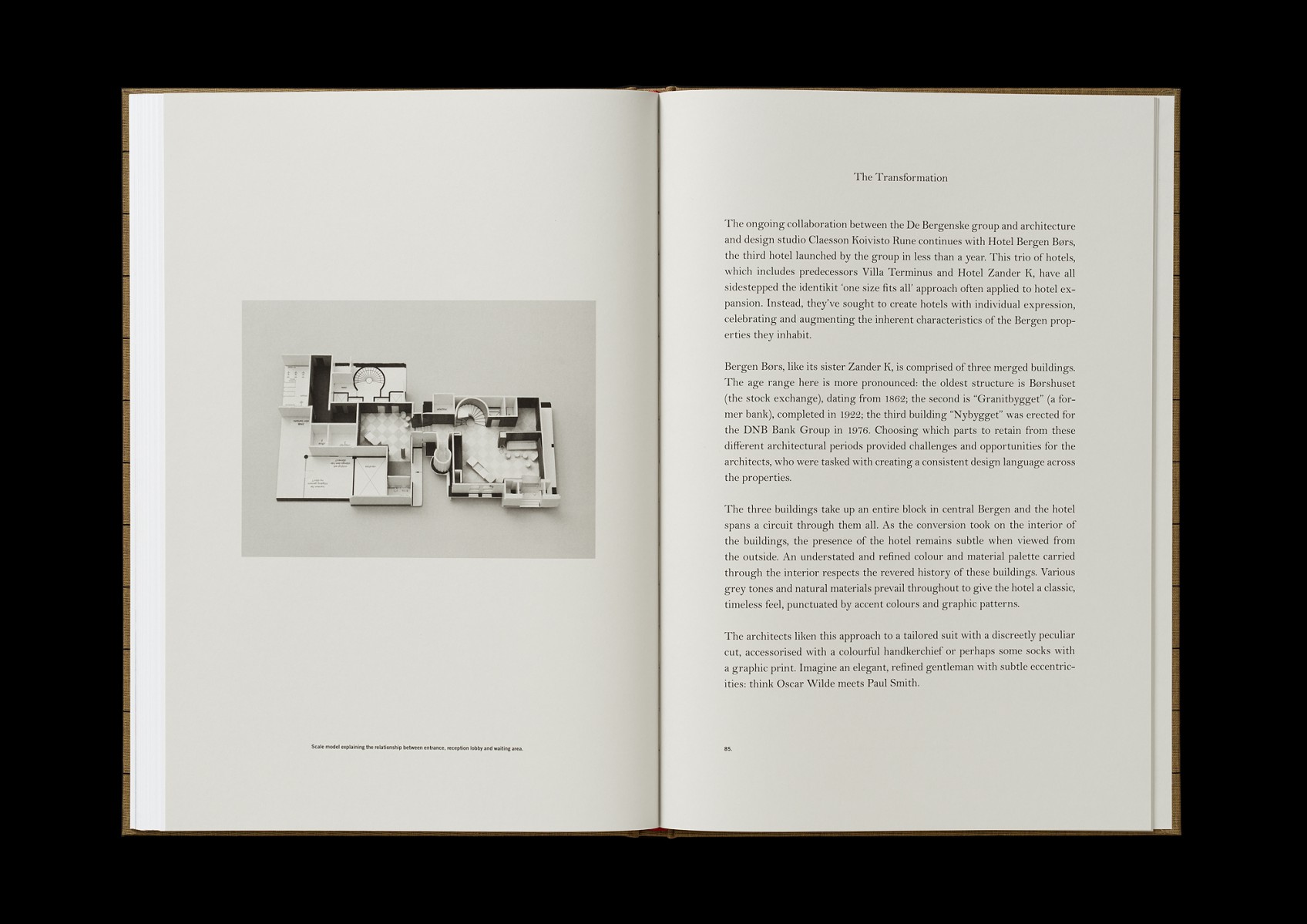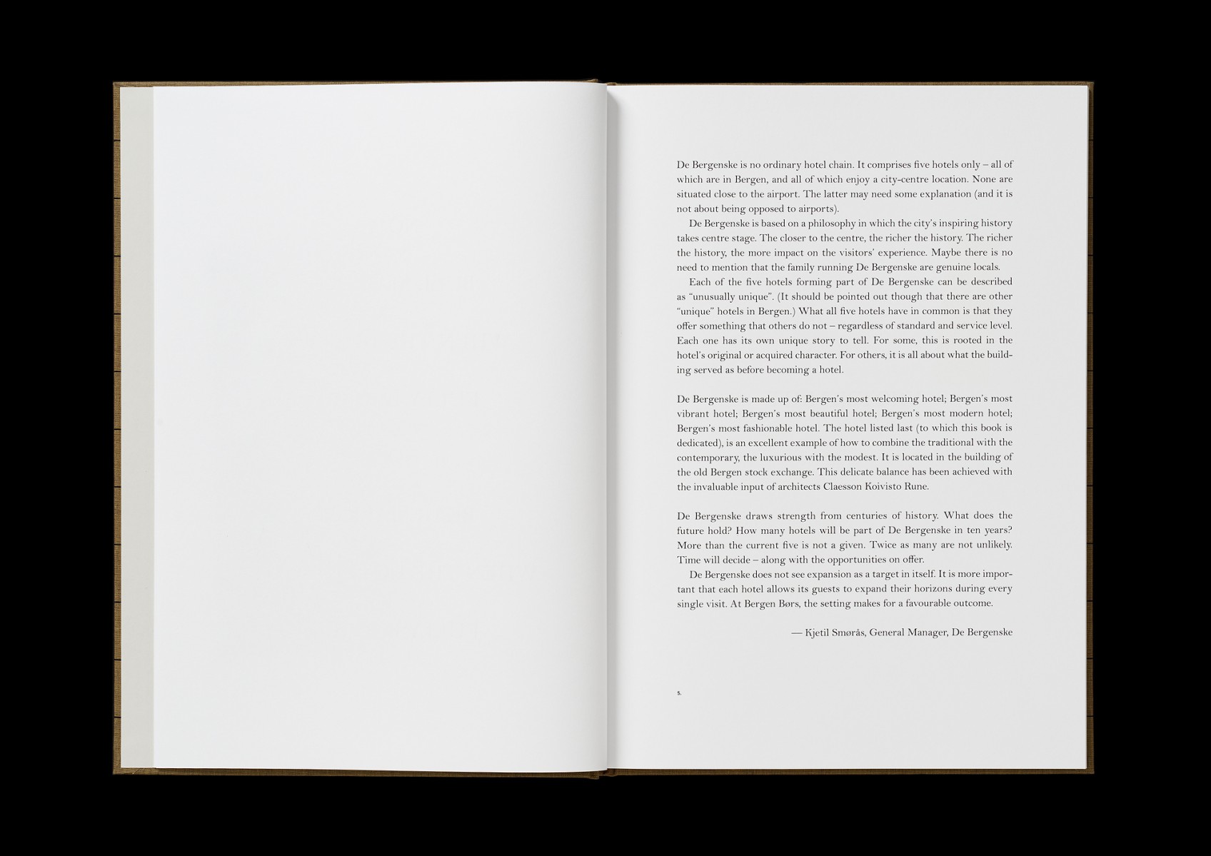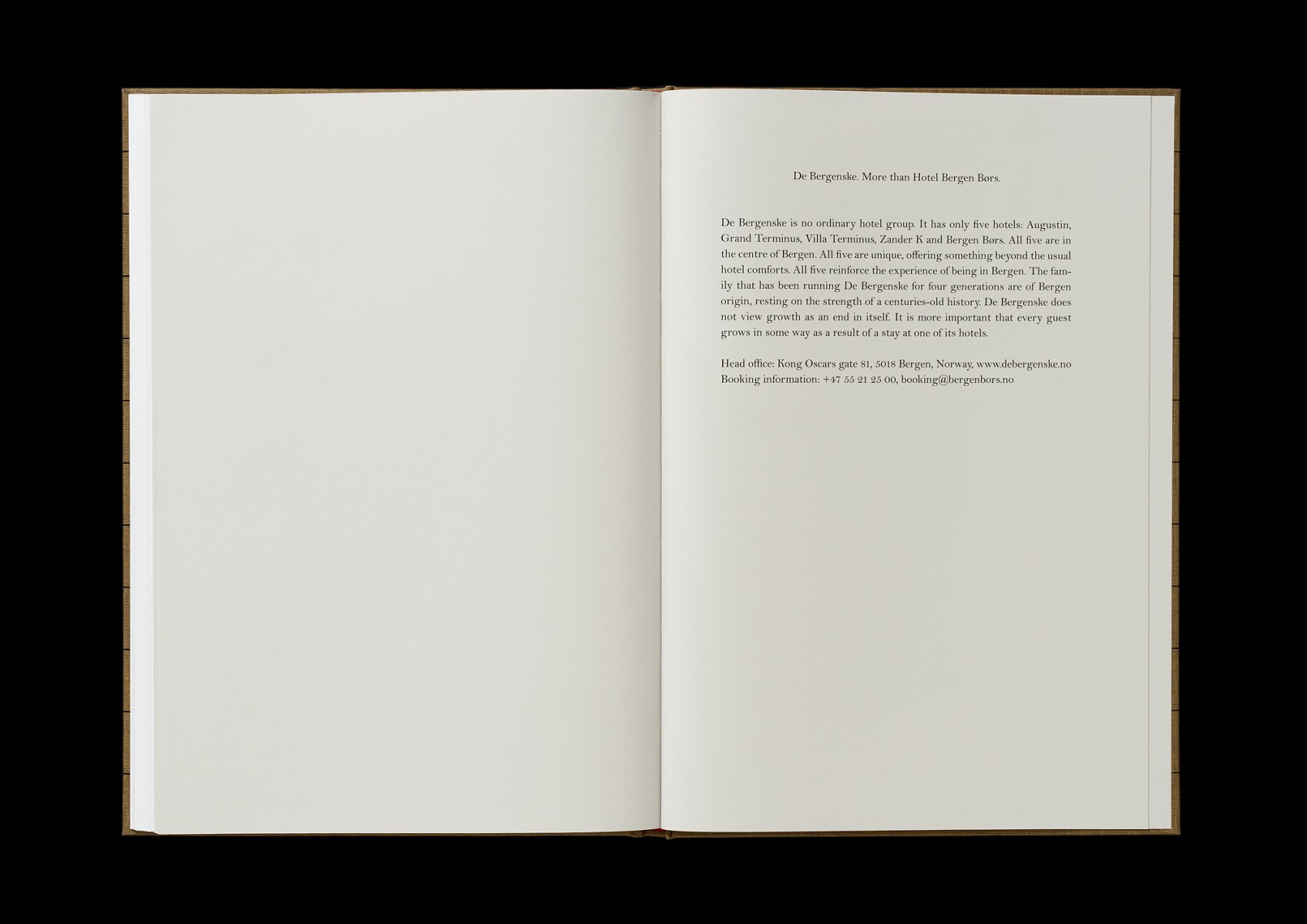 The book Hotel Bergen Børs, A Truly Unique Hotel in Bergen commissioned by the hotel company De Bergenske (Norway).