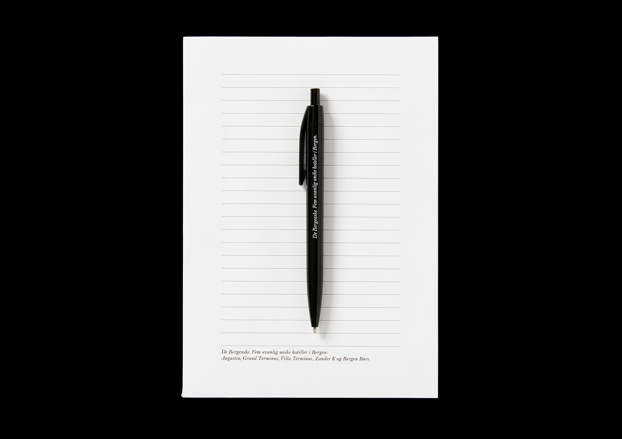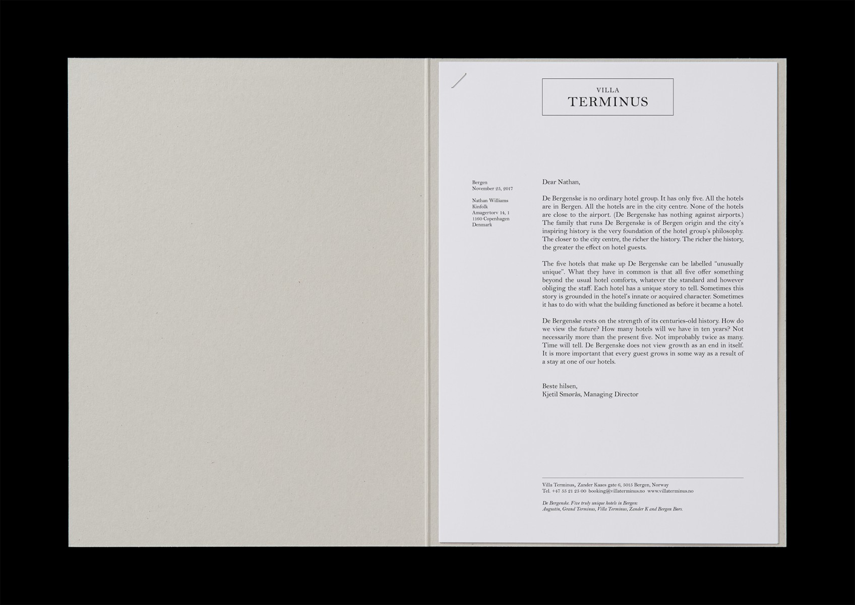 New identity for Villa Terminus, a truly unique hotel in Bergen (Norway). Commissioned by the hotel company De Bergenske which also operates the hotels Grand Hotel Terminus, Hotel Zander K, Hotel Bergen Børs and Hotel Augustin.