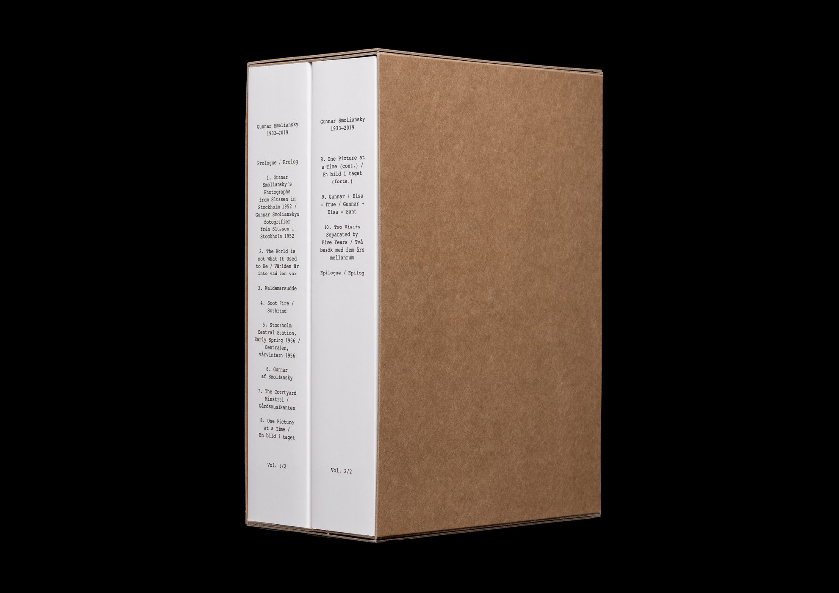 A limited and numbered edition of the book Gunnar Smoliansky 1933–2019, a re-release of nine projects and collaborations between Gunnar Smoliansky and Henrik Nygren, the years 2002–2008, in two volumes: Gunnar Smoliansky's Photographs from Slussen in Stockholm 1952, The World is not What It Used to Be, Waldemarsudde, Soot Fire, Stockholm Central Station, Early spring 1956, Gunnar af Smoliansky, The Courtyard Minstrel, One Picture at a Time, Gunnar + Elsa = True, and the newly written chapter Two Visits Separated by Five Years.