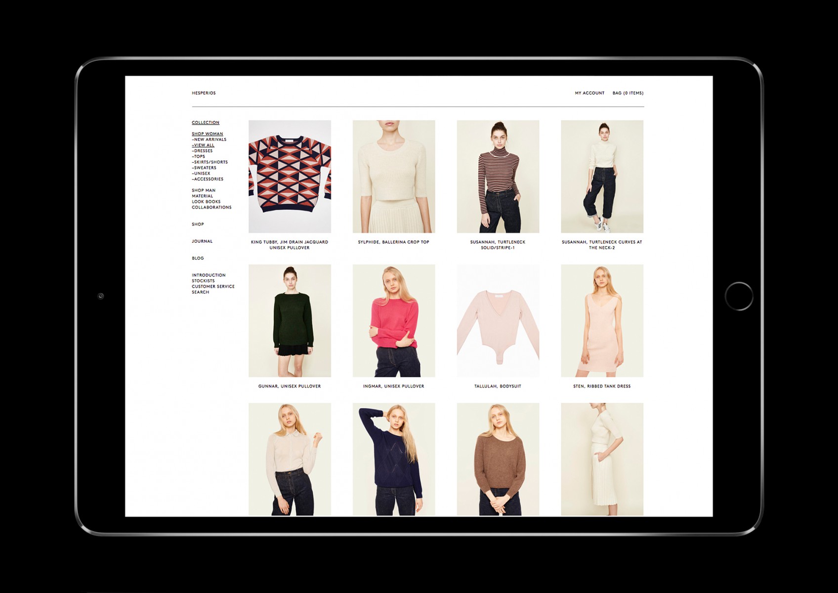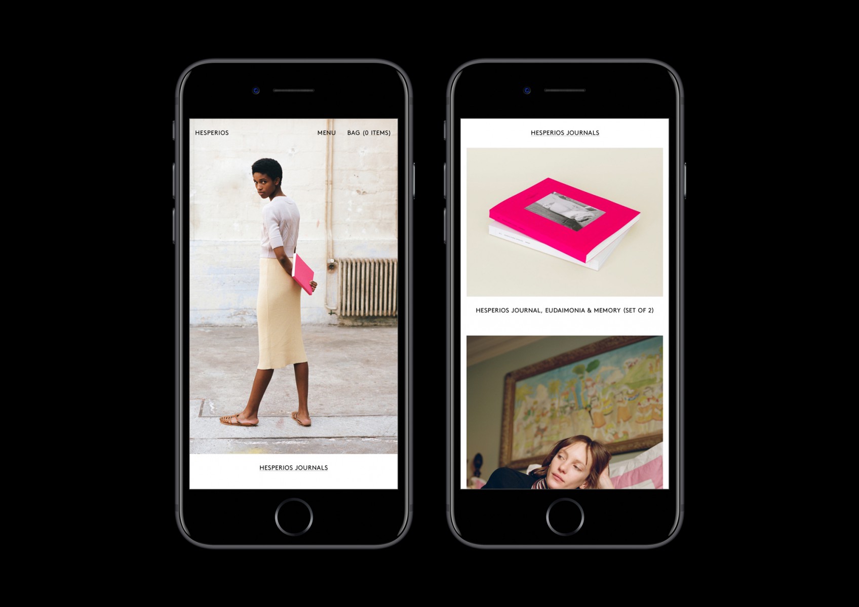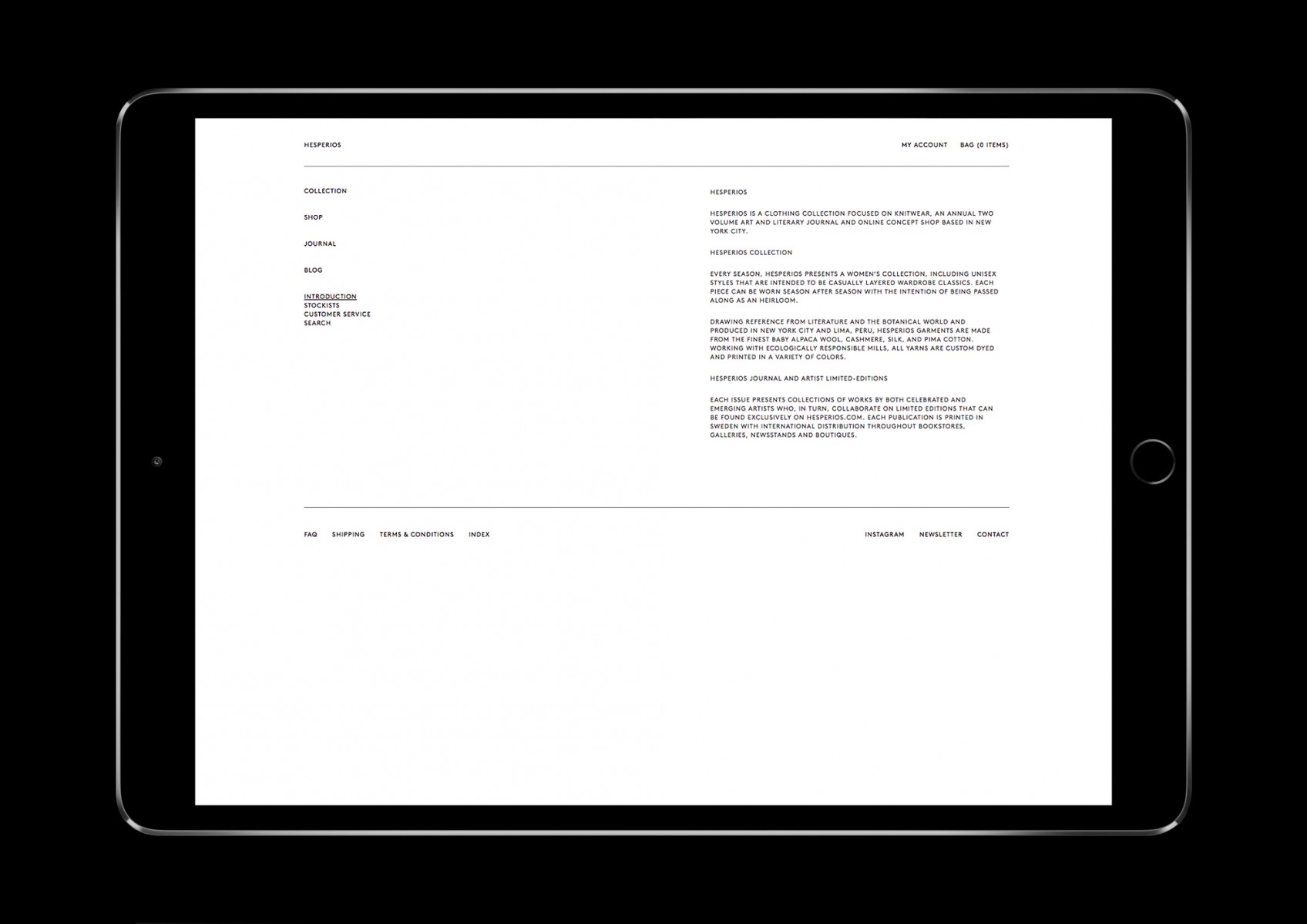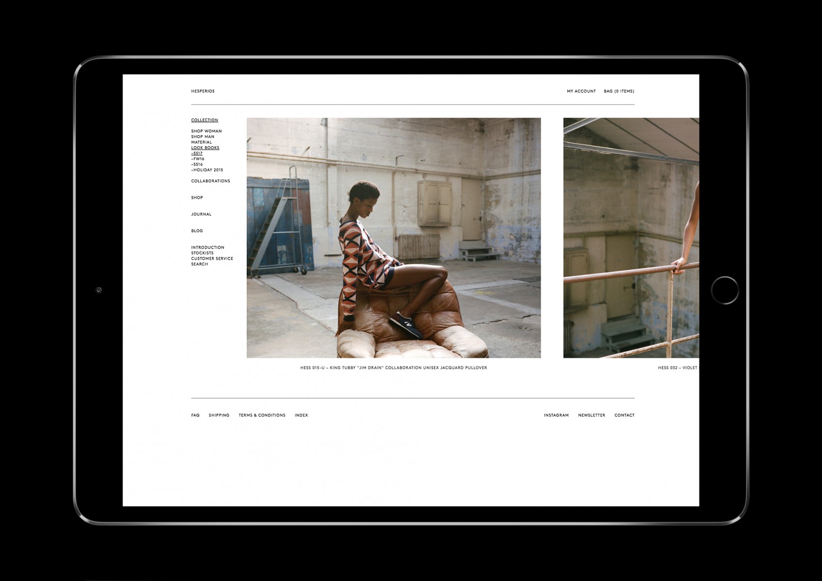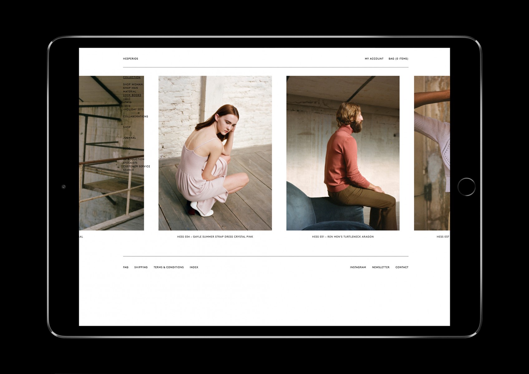Website commissioned by the American company Hesperios in connection with the release of its first cloth collections, the Hesperios Journal, a series of product, etc.