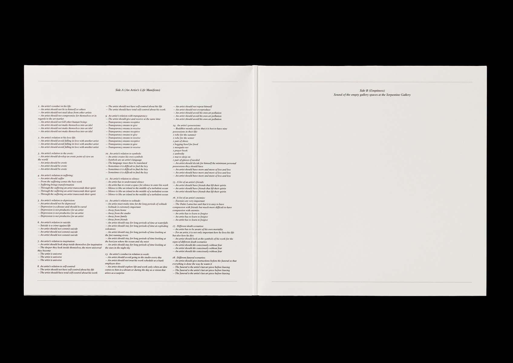 Editor: Sophie O’Brien. Text: Marina Abramović (Life Manifesto).Signed and numbered album in an edition of 100 examples, 315x315 mm, offset.