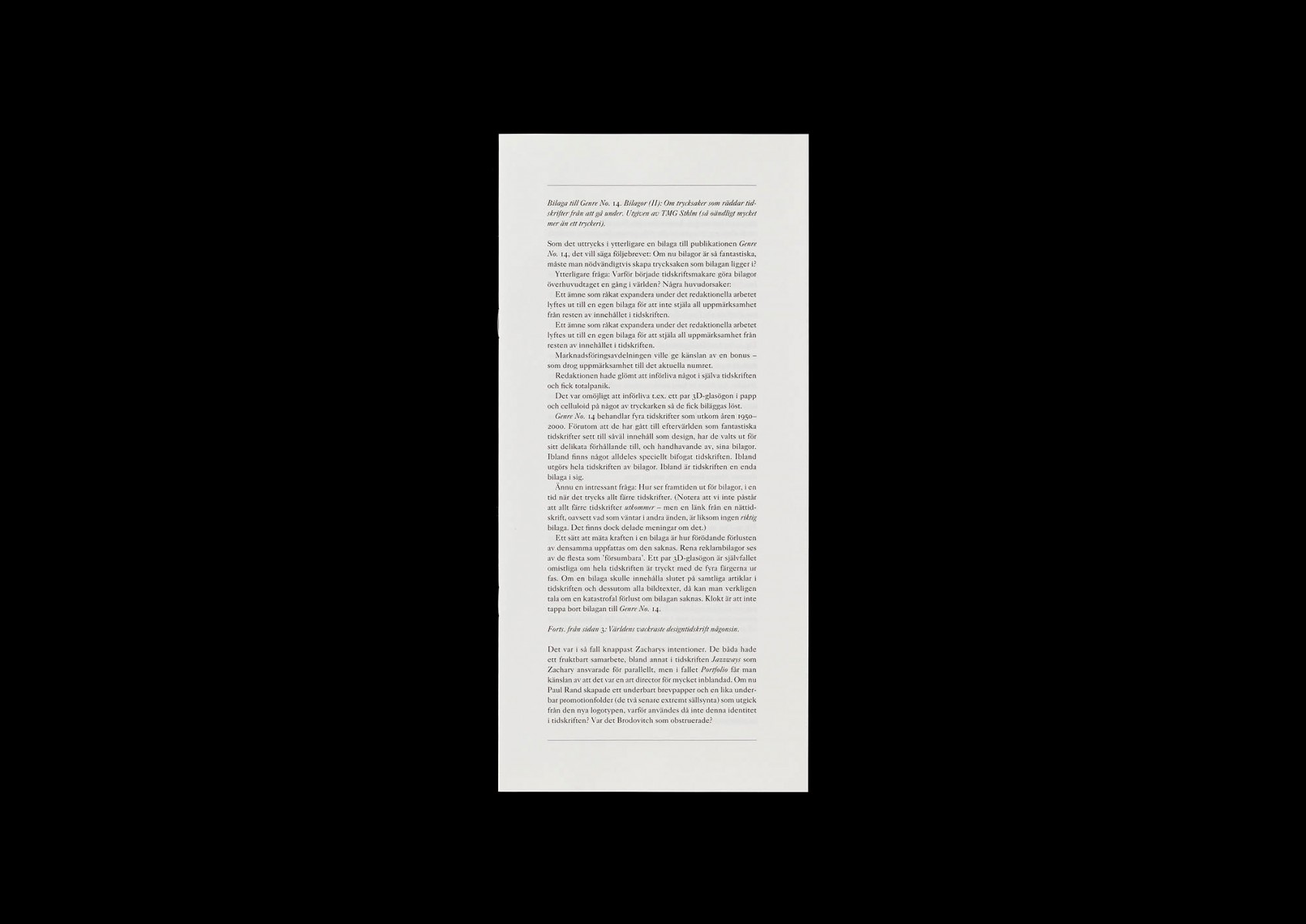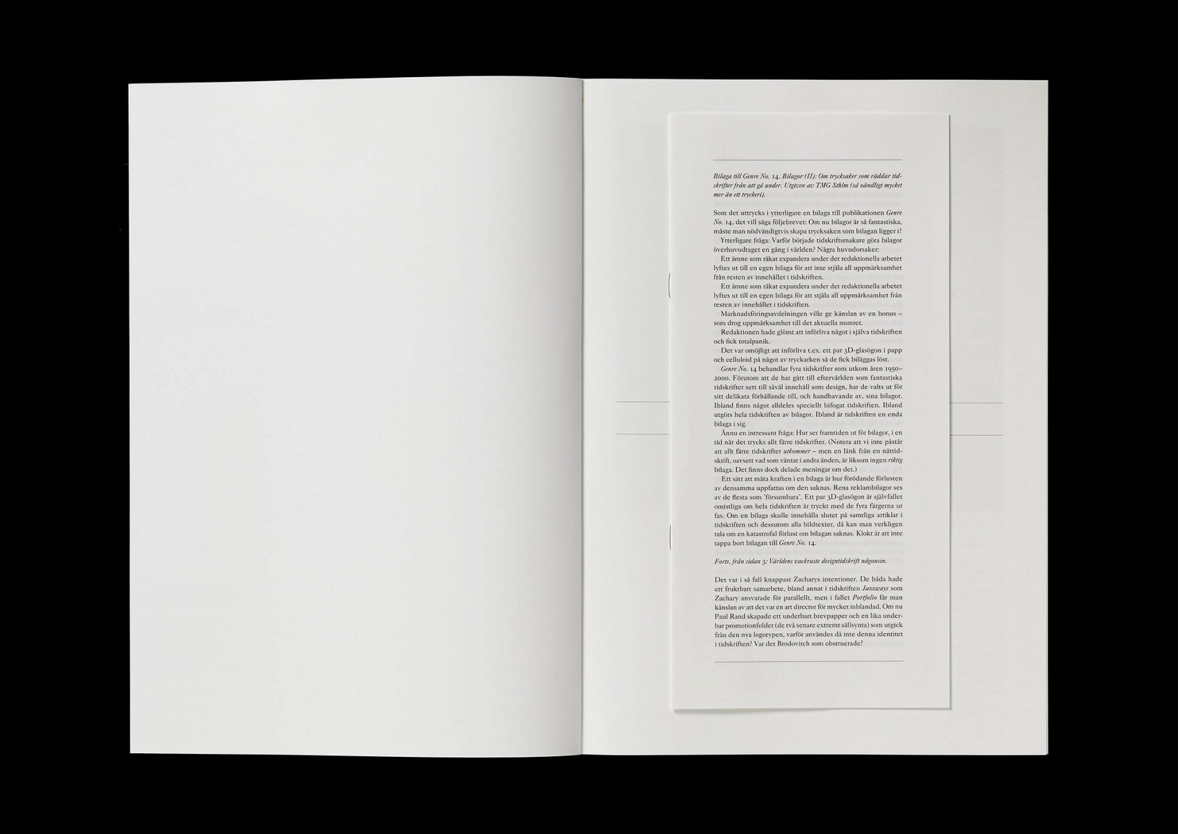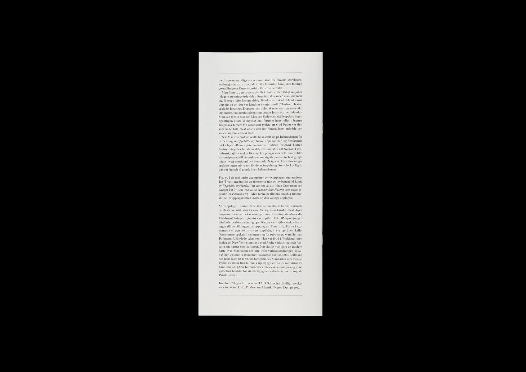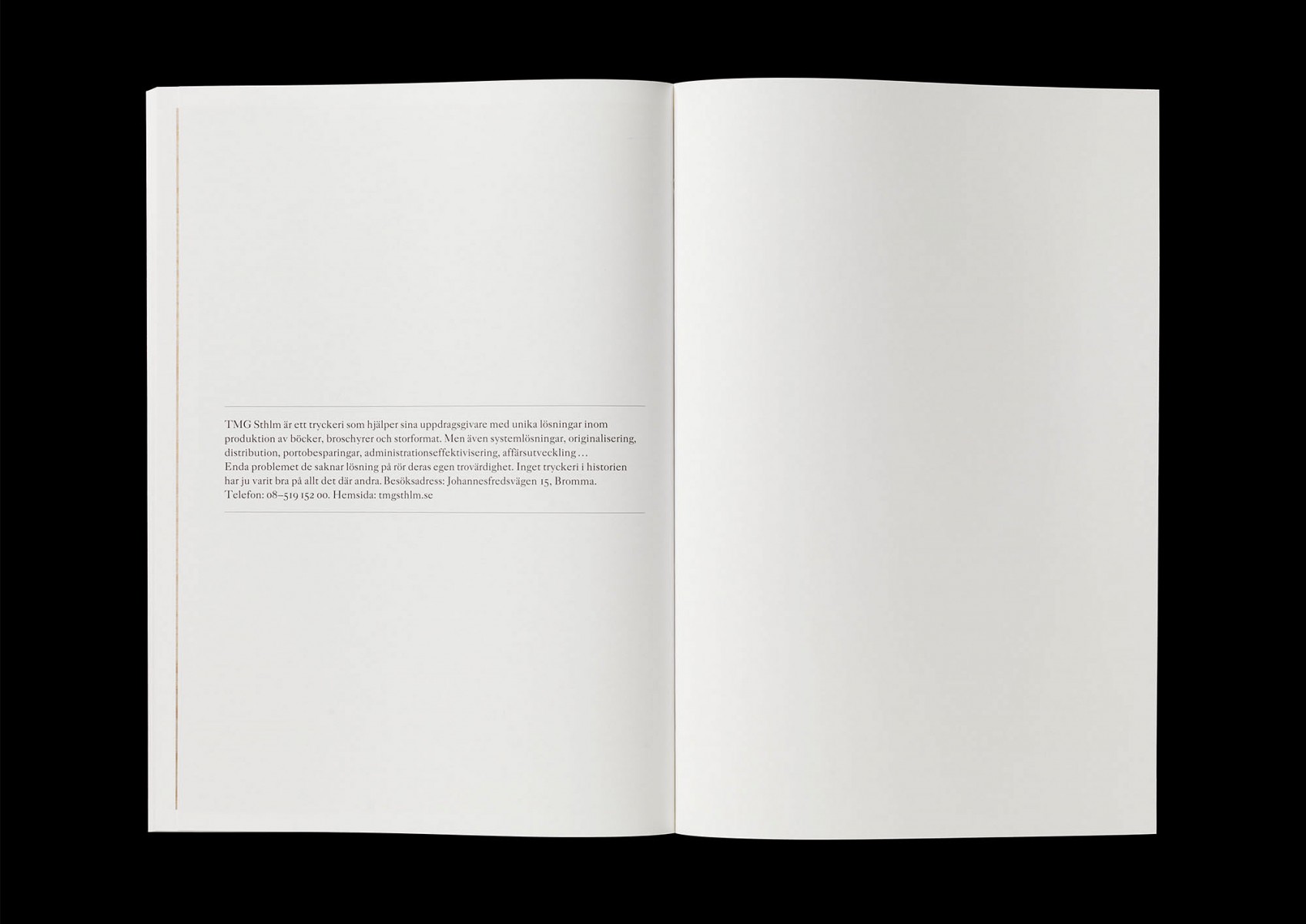 Publication: 80 pp., 240x340 mm, color offset. Supplement: 16 pp., 148x210 mm, offset. Photography of conference rooms: Patrik Lindell. Commissioned by TMG Sthlm printers, Bromma.