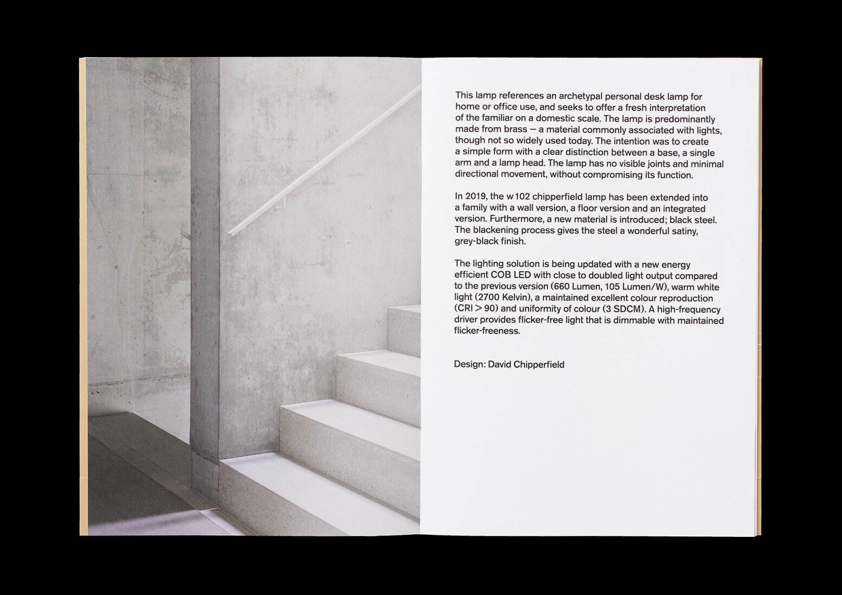The catalogue Wästberg introducing: w102 chipperfield (the extended family), produced in conjunction with the exhibition on David Chipperfield at Skridskopaviljongen, during Stockholm Furniture & Light Fair 2019 and commissioned by the lighting company Wästberg. Exhibition in collaboration with Alessi and e15.
