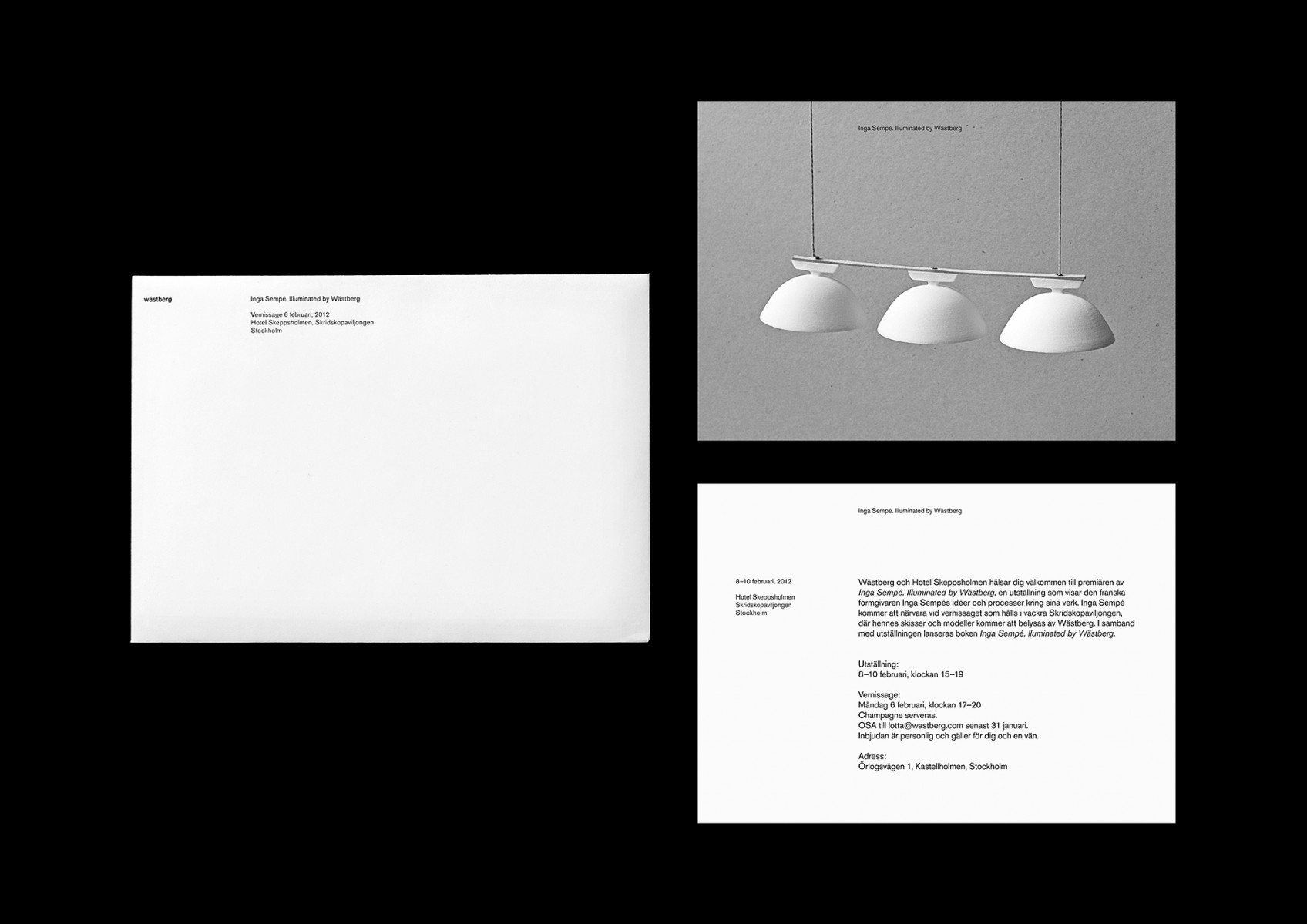 Book, invitations and exhibition commissioned by Wästberg: Inga Sempé. Illuminated by Wästberg, published in conjunction with the exhibition with the same name at the Skating Pavilion in Stockholm in 2012.