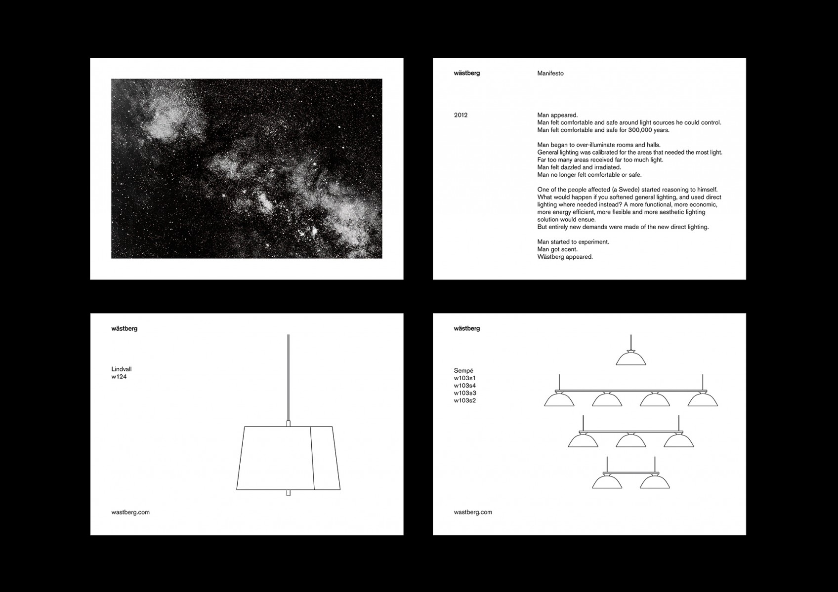 Product catalogue commissioned by the lighting company Wästberg in conjunction with the exhibition at the Stockholm Furniture & Light Fair 2012.