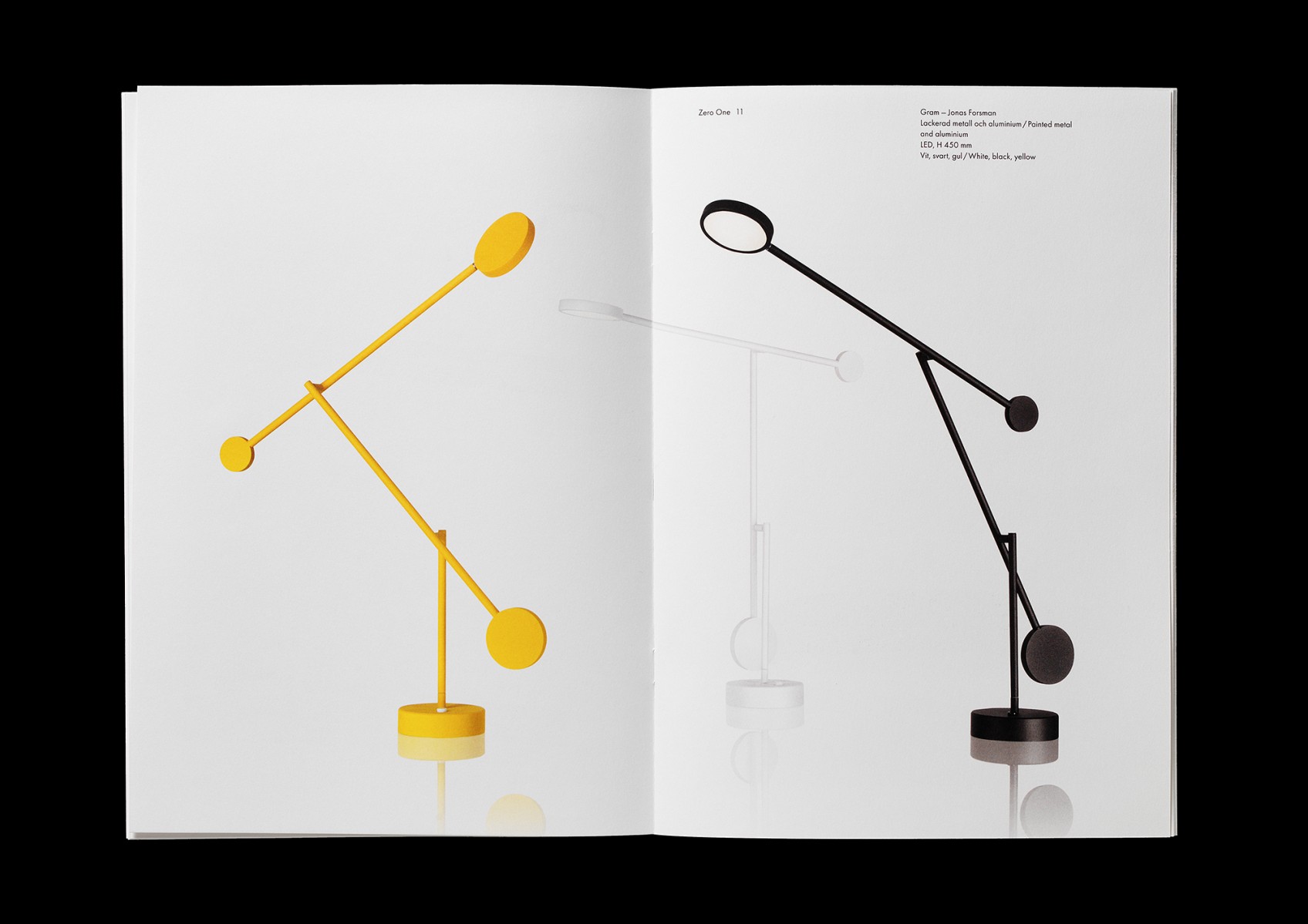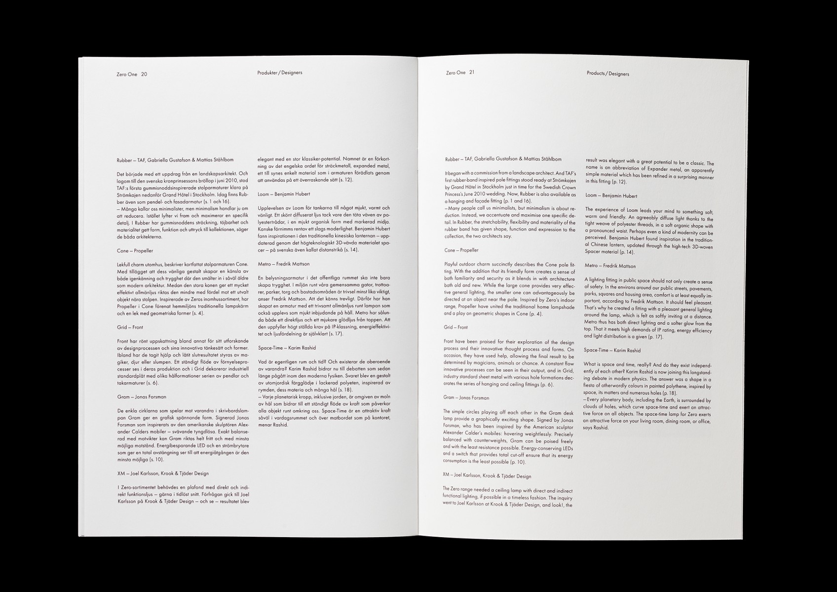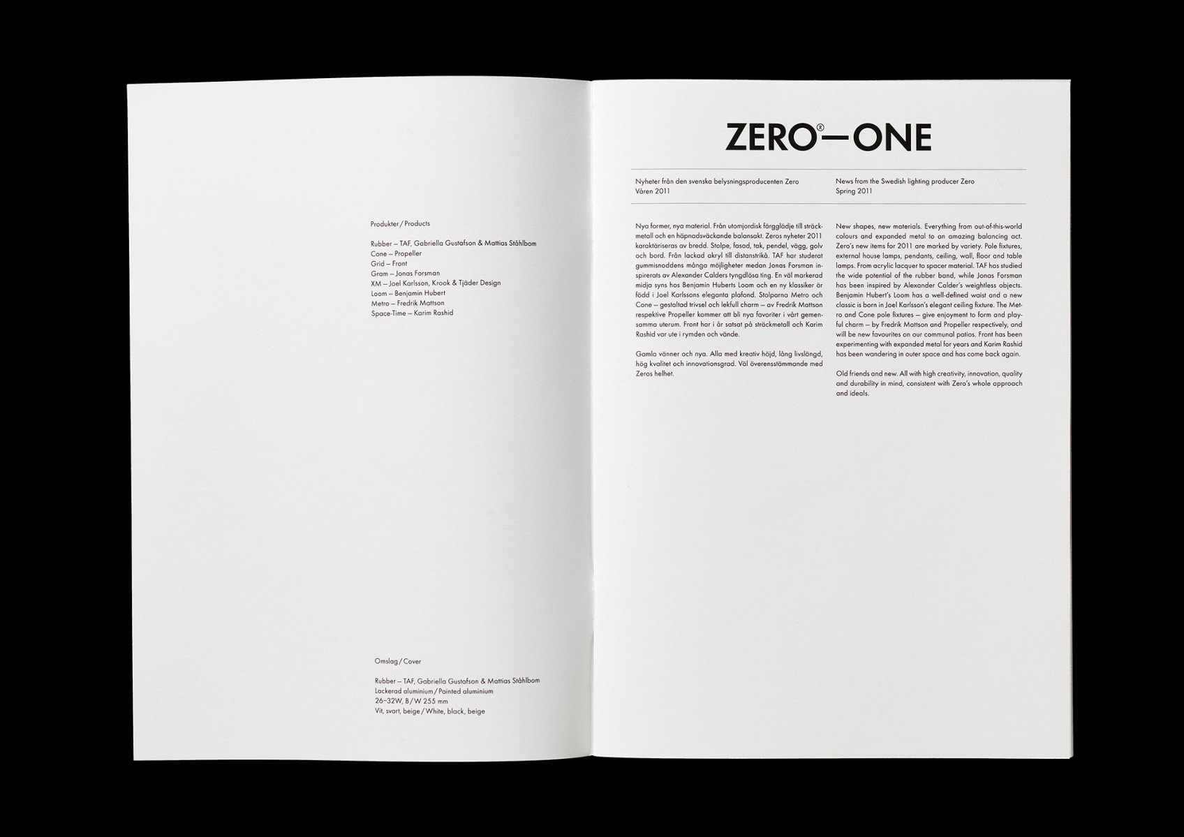 Zero One, the first in a serie of printed matters from Swedish lighting company Zero in Nybro. Published in connection to the Stockholm Furniture Fair & Northern Light Fair 2011. Swedish and English text.