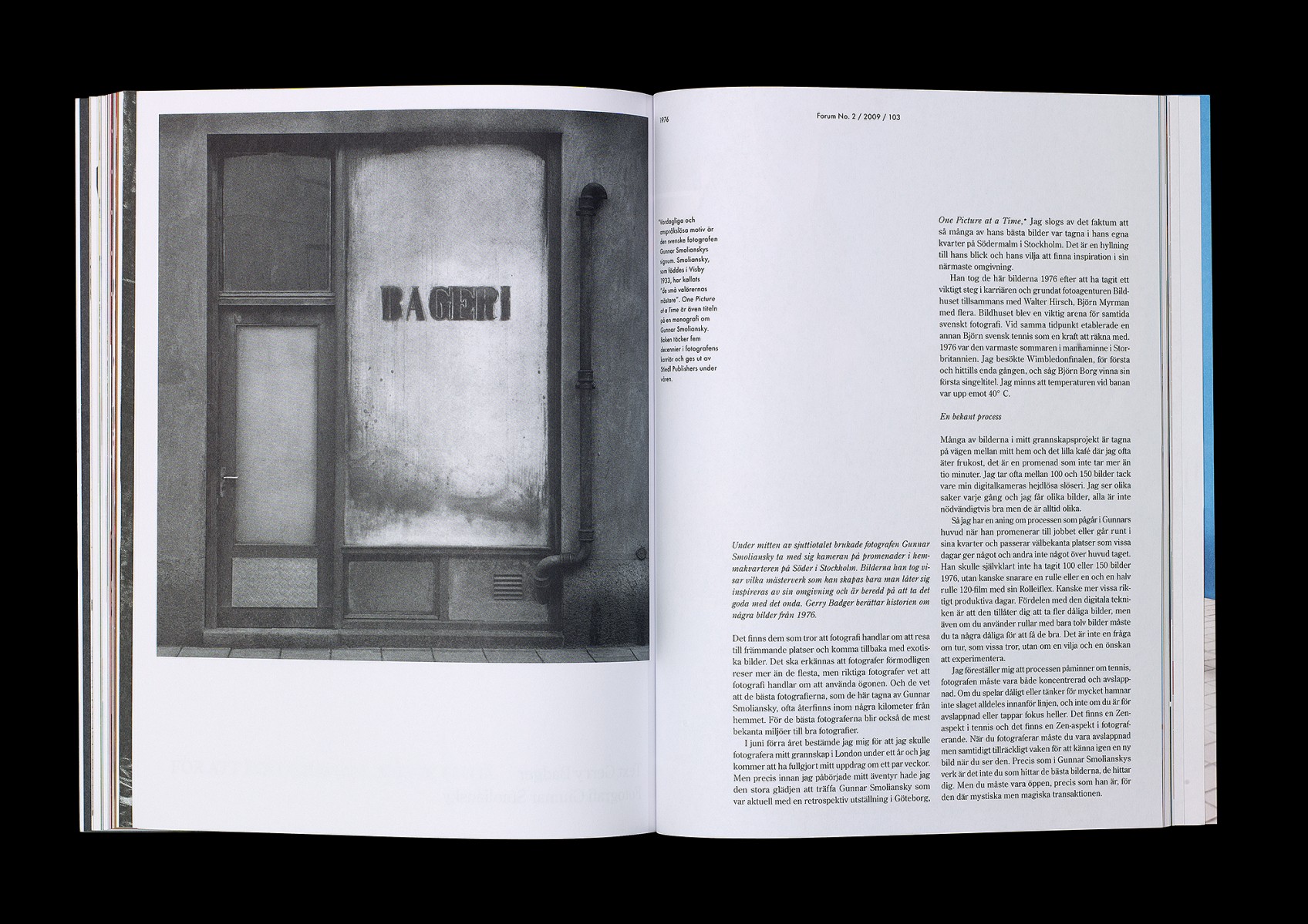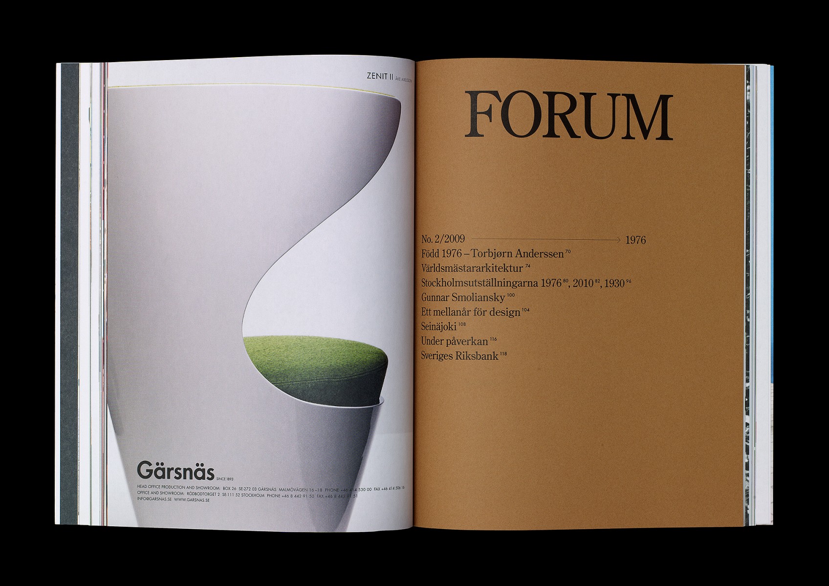 Redesign, redaktionsmedverkan, art direction och produktion av kvartalsmagasinet Forum, magasin för nordisk arkitektur, inredning och design. No. 2/2009 (tema: 1976 – året första numret utkom).