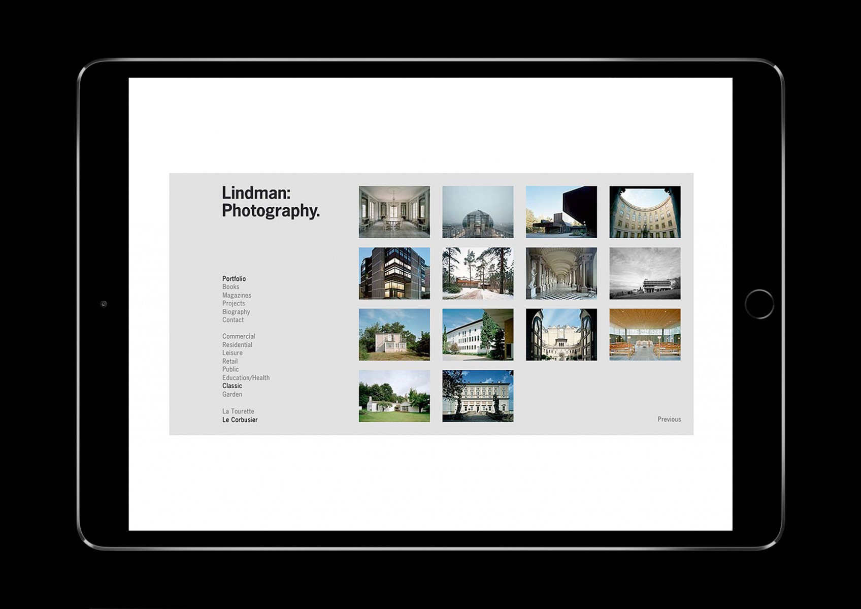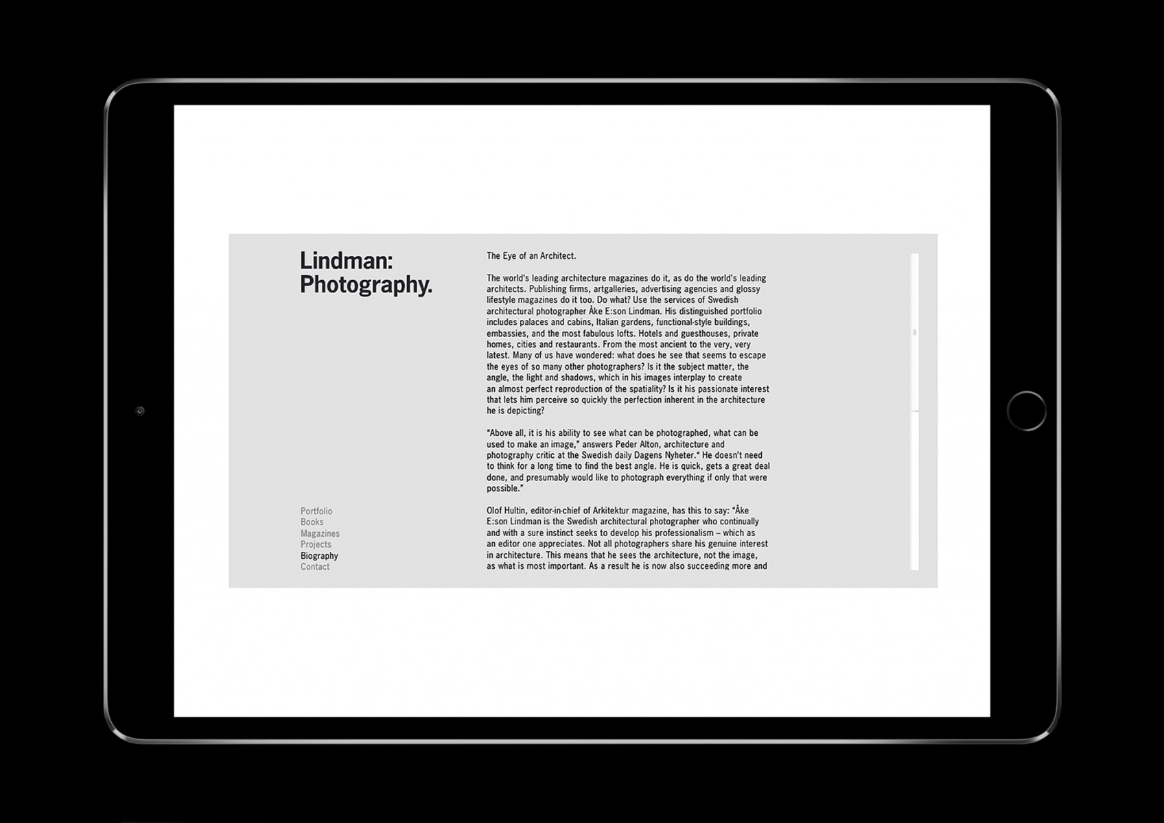 Identitet och hemsida för arkitekturfotografen Åke E:son Lindmans företag Lindman Photography. Namn, logotype, typografi, förpackningar, textmallar, stationery m.m. (2007)