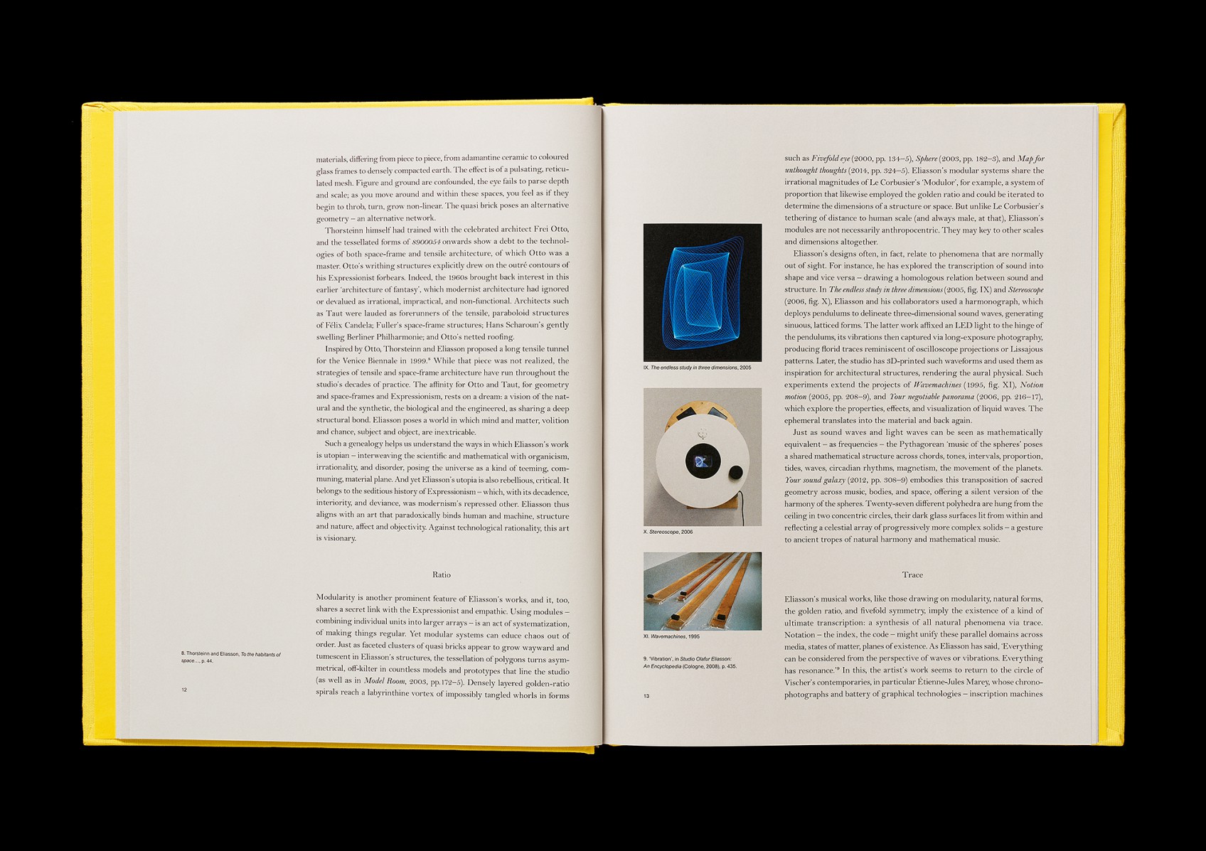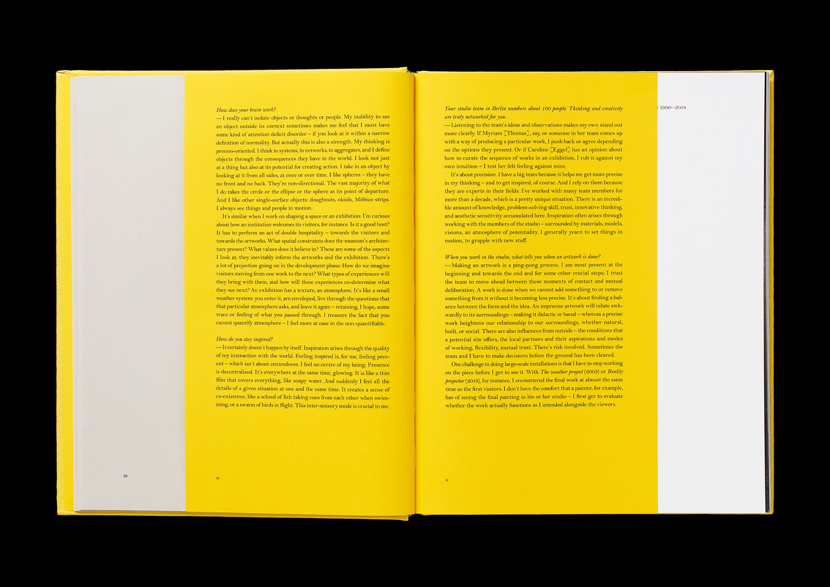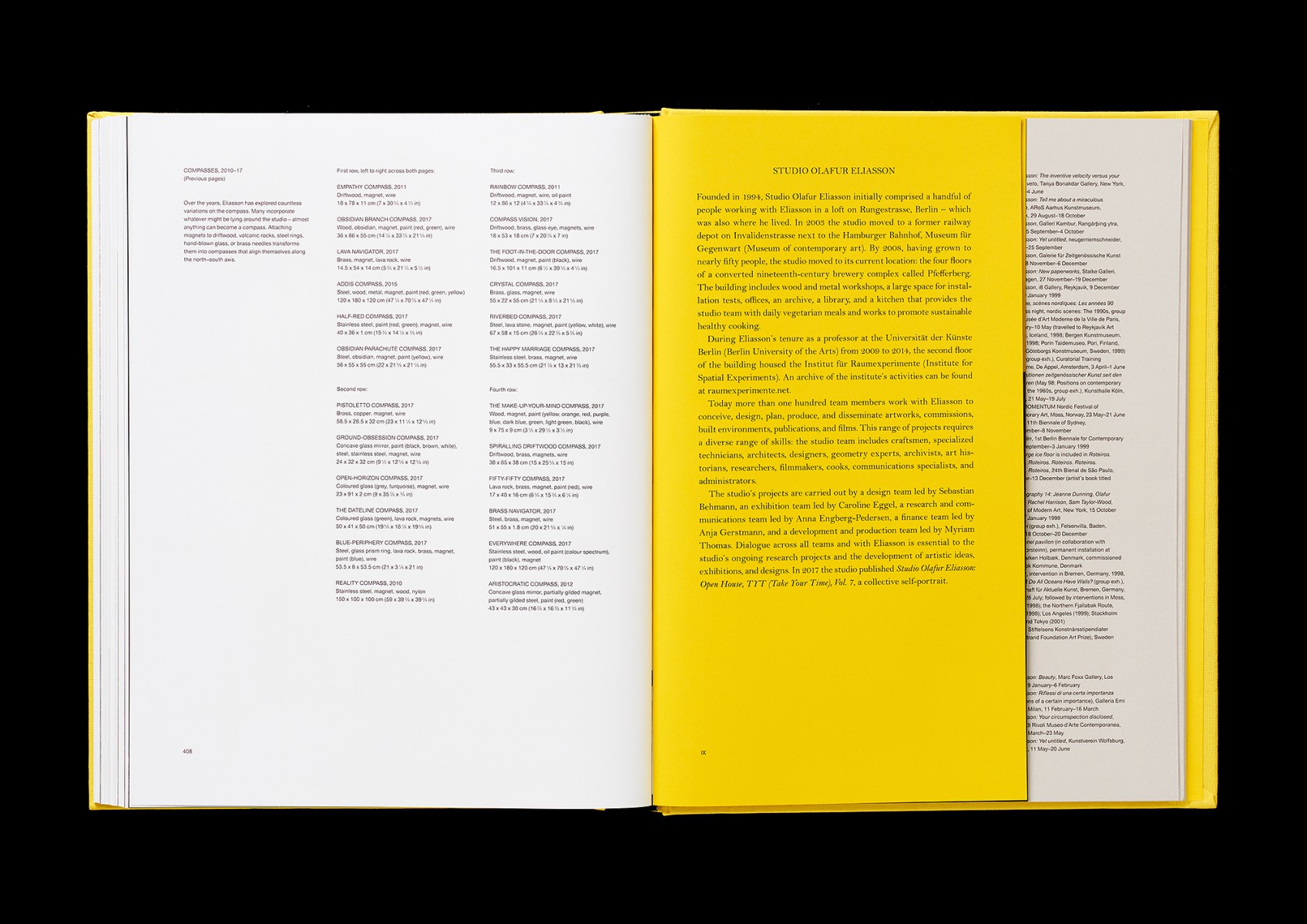 Hårdband, 422 sidor (varav två inbundna bilagor om 24 sidor), 230x305 mm. Folierat och screentryckt omslag med inklistrad bild på baksidan. Inlaga tryckt i offset. I samarbete med Studio Olafur Eliasson (Tyskland). (2017–18)