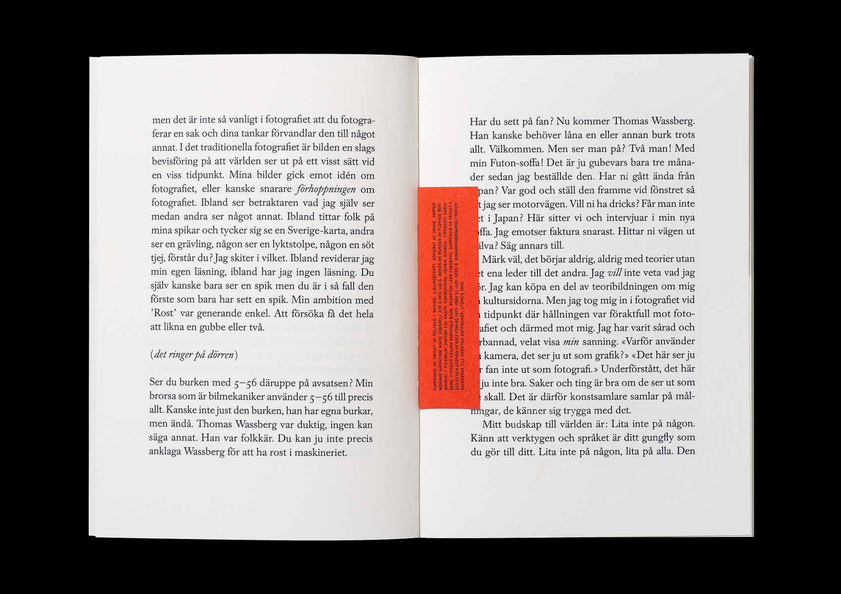 Häftad, 36 sidor, 160x230 mm, offset och boktryck i en numrerad upplaga av 333 exemplar. Inkl. signerad print: "Dawid, 41,2°C på morgonen". (1995)