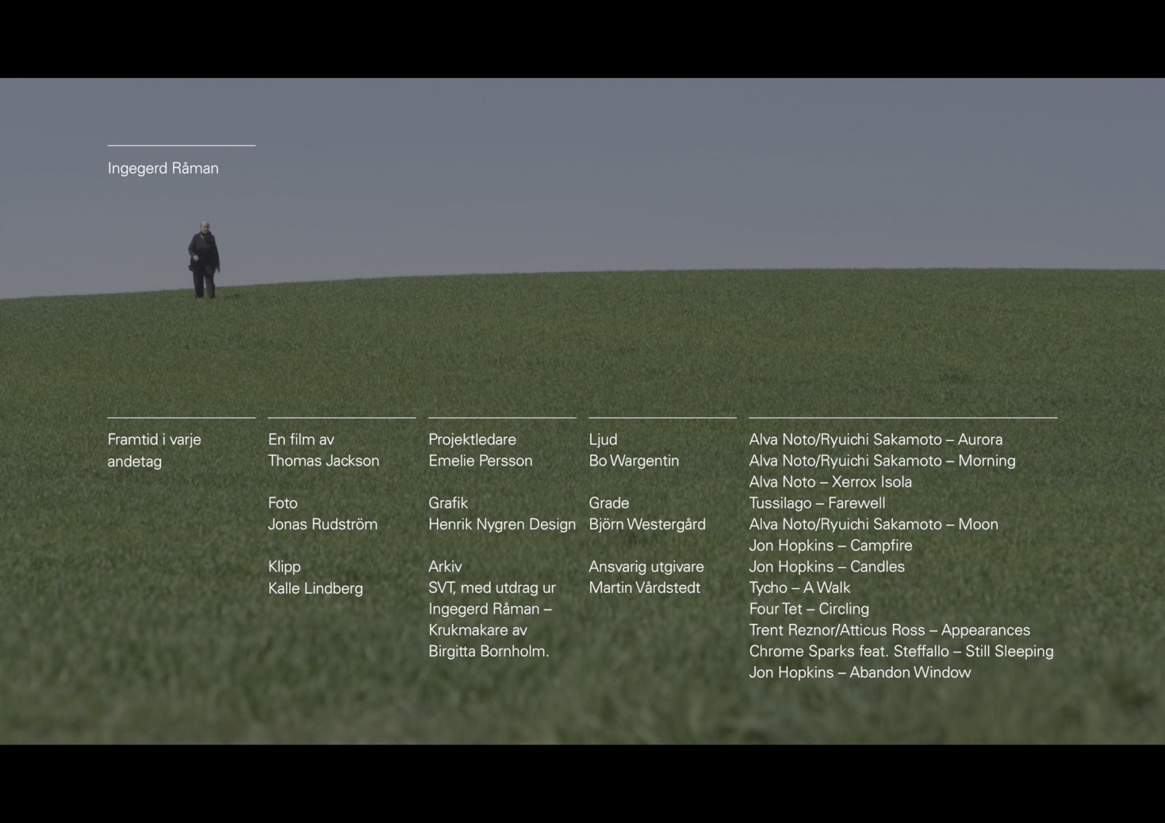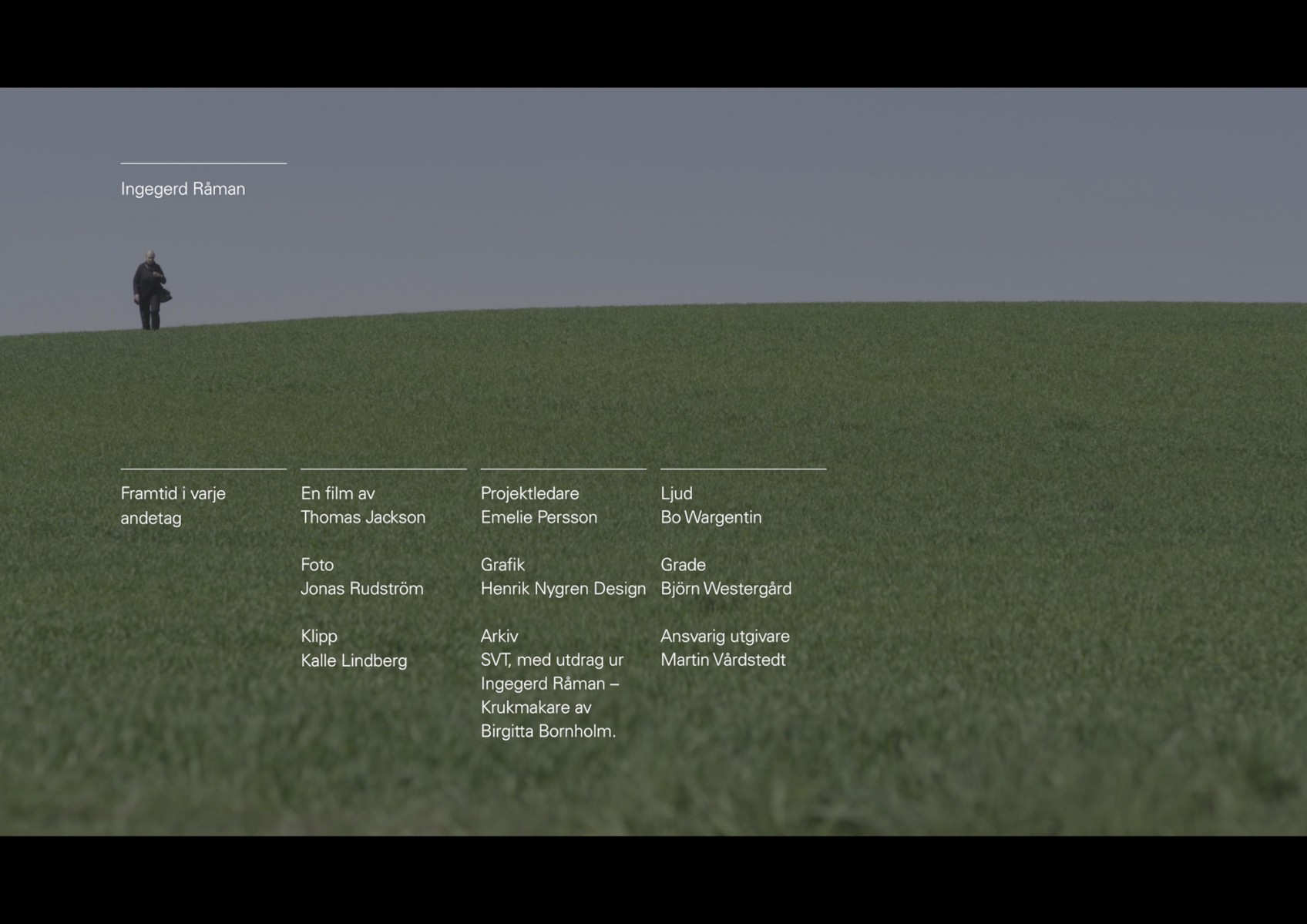 Filmen Framtid i varje andetag om professorn och krukmakaren Ingegerd Råman. Inspelat på flertalet platser i Sverige, Japan och Italien. I samarbete med producent Thomas Jackson, fotograf Jonas Rudström och klippare Kalle Lindberg.