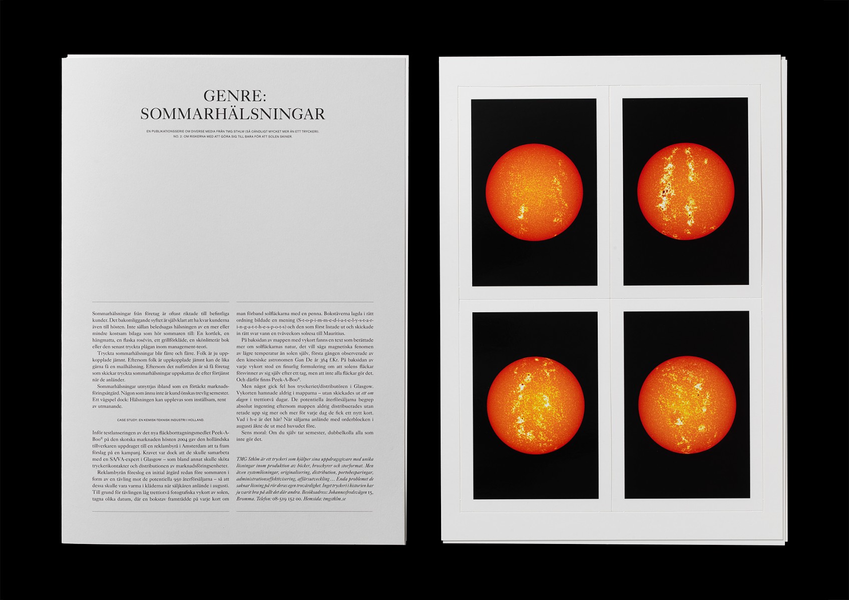 Andra enheten i publikationsserien om diverse media. Genre: Sommarhälsningar. No. 2: Om riskerna med att göra sig till bara för att solen skiner. Kuvert samt mapp med tolv stansade vykort på tre blad.