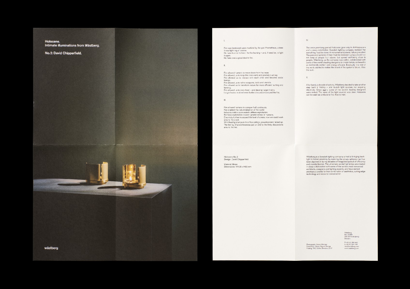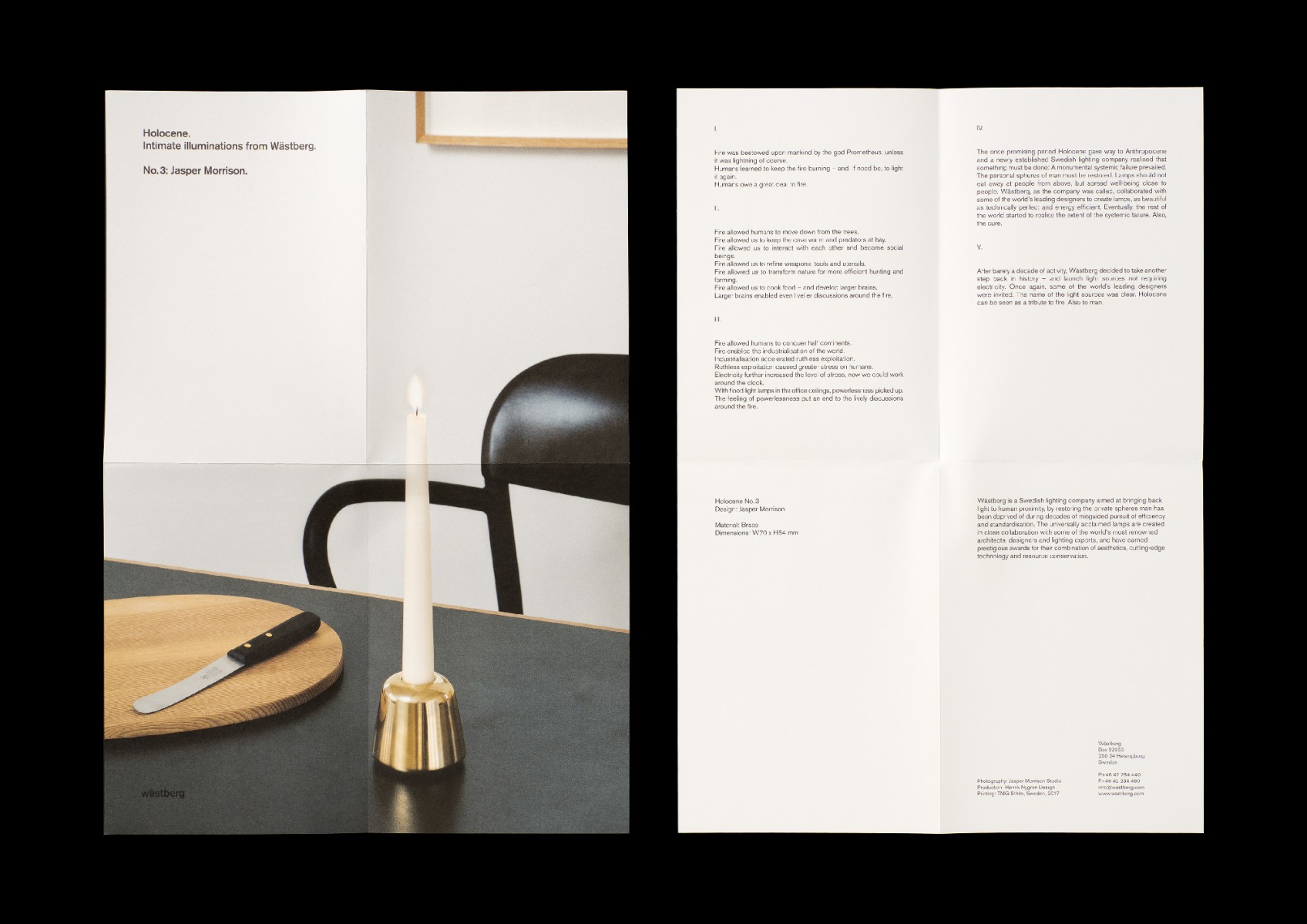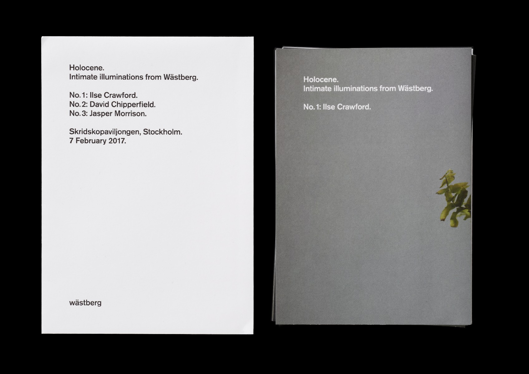 Inbjudan, trycksaker, Lamps for Neanderthal Man, A Manifesto, tote bags samt utställning och lansering av Holocene, Intimate Illumniations from Wästberg på Skridskopaviljongen, i samband med Stockholm Furniture & Light Fair 2017, på uppdrag av belysningsföretaget Wästberg. Produkter av Ilse Crawford, David Chipperfield och Jasper Morrison.
