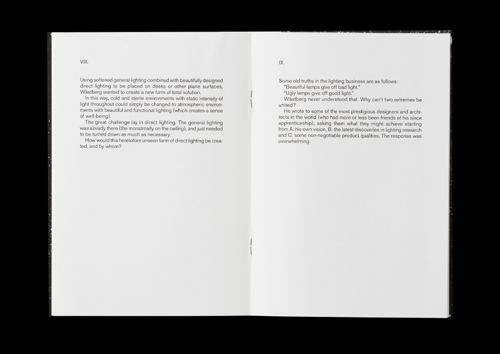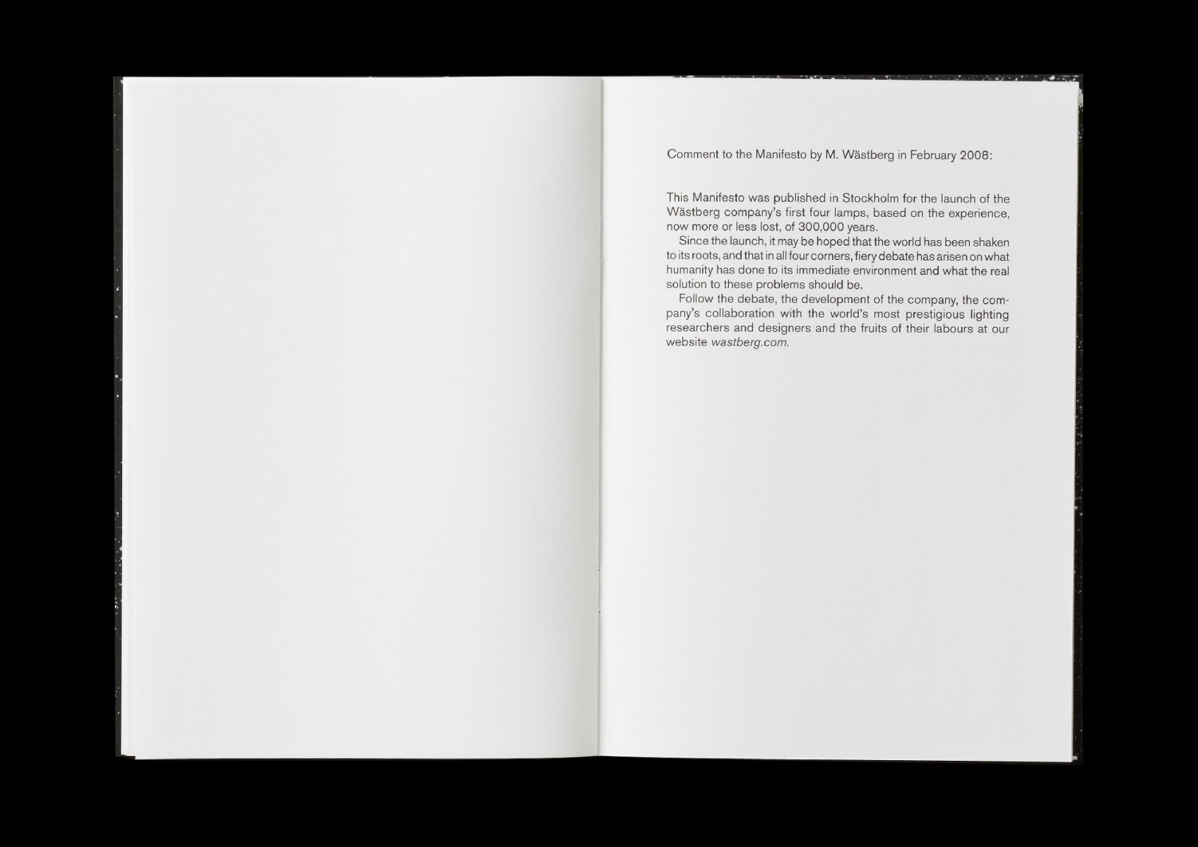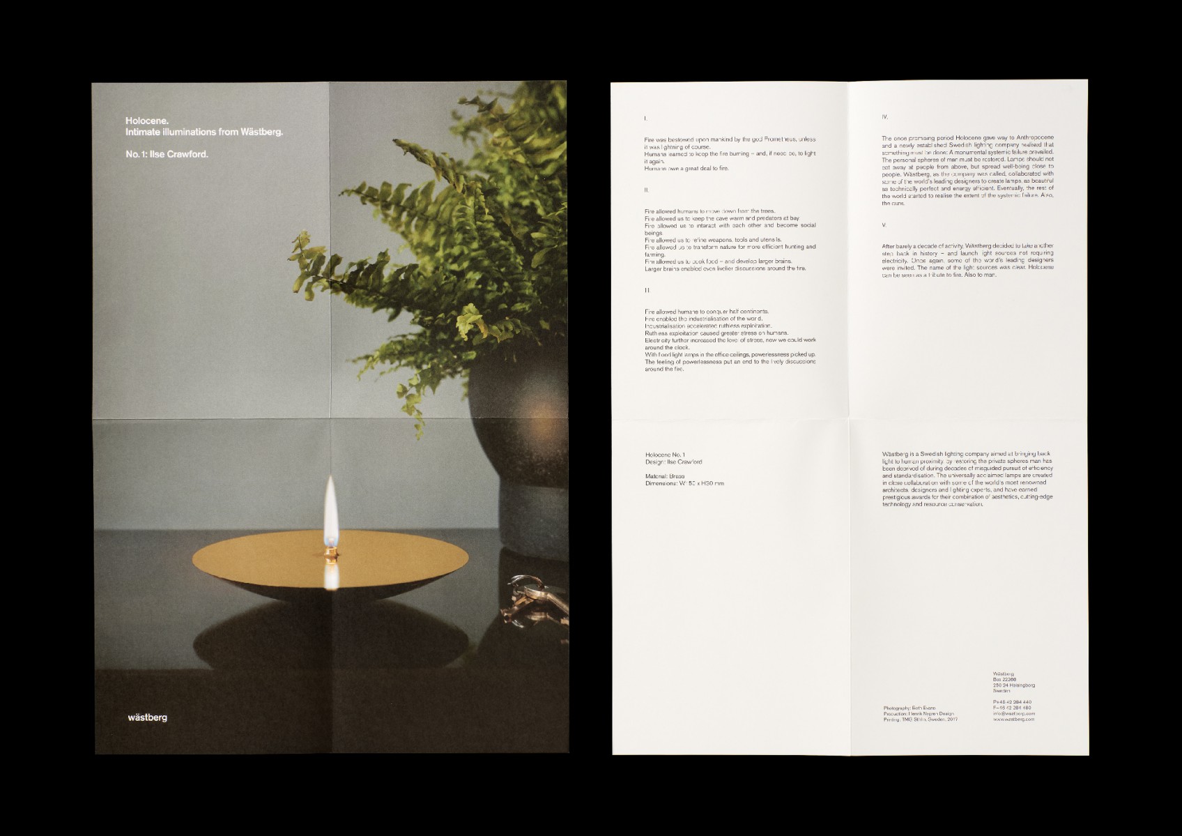 Inbjudan, trycksaker, Lamps for Neanderthal Man, A Manifesto, tote bags samt utställning och lansering av Holocene, Intimate Illumniations from Wästberg på Skridskopaviljongen, i samband med Stockholm Furniture & Light Fair 2017, på uppdrag av belysningsföretaget Wästberg. Produkter av Ilse Crawford, David Chipperfield och Jasper Morrison.