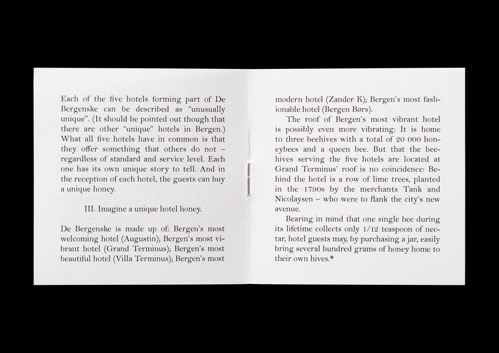 Identitet och förpackning åt De Bergenske Hotel Honey och den egenproducerade honungen från taket på Grand Hotel Terminus (Bergen). På uppdrag av hotell- och serviceföretaget De Bergenske (Norge).