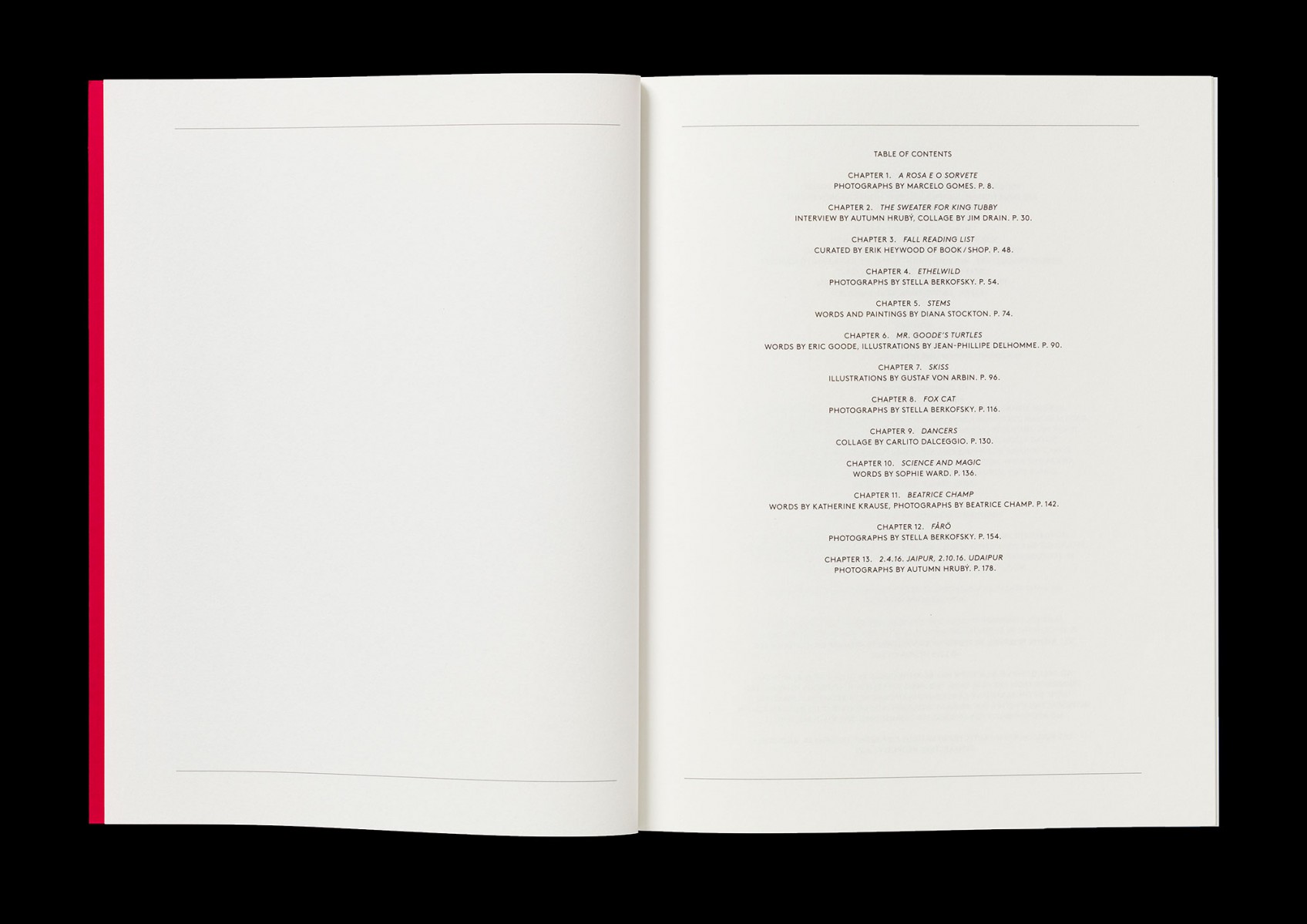 Text: Eric Goode, Erik Heywood, Autumn Hrubý, Katherine Krause, Diana Stockton, Sophie Ward m.fl. Fotografi och illustration: Gustaf von Arbin, Stella Berkofsky, Beatrice Champ, Carlito Dalceggio, Jean-Phillipe Delhomme, Jim Drain, Marcelo Gomes, Autumn Hrubý och Diana Stockton.
