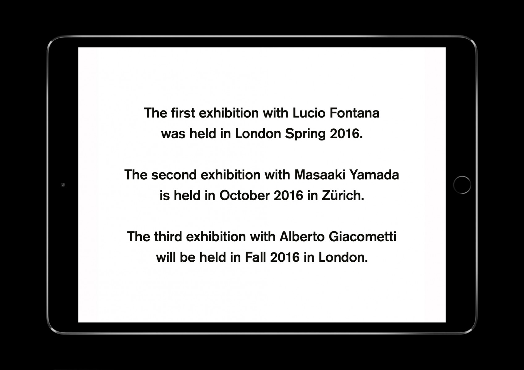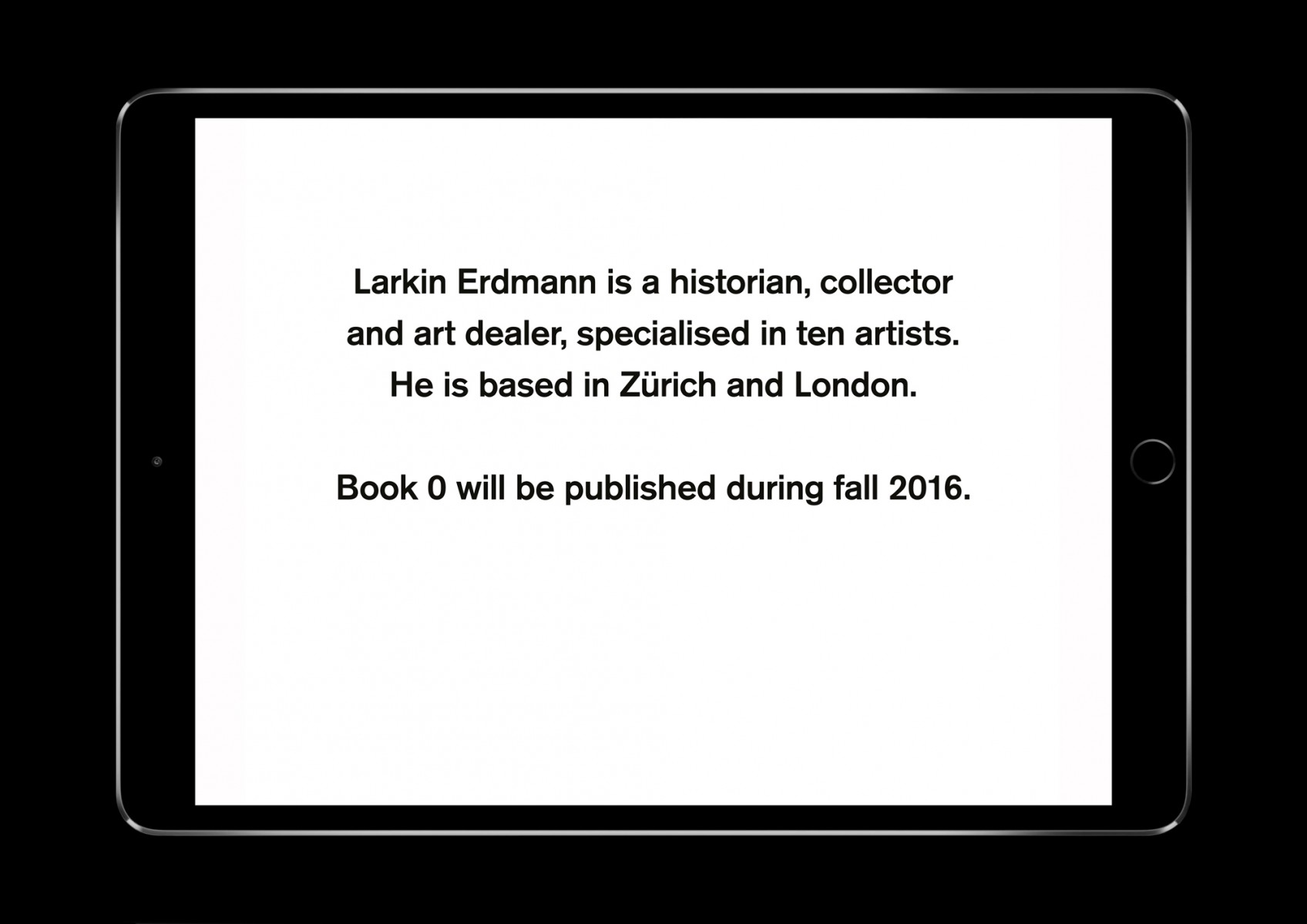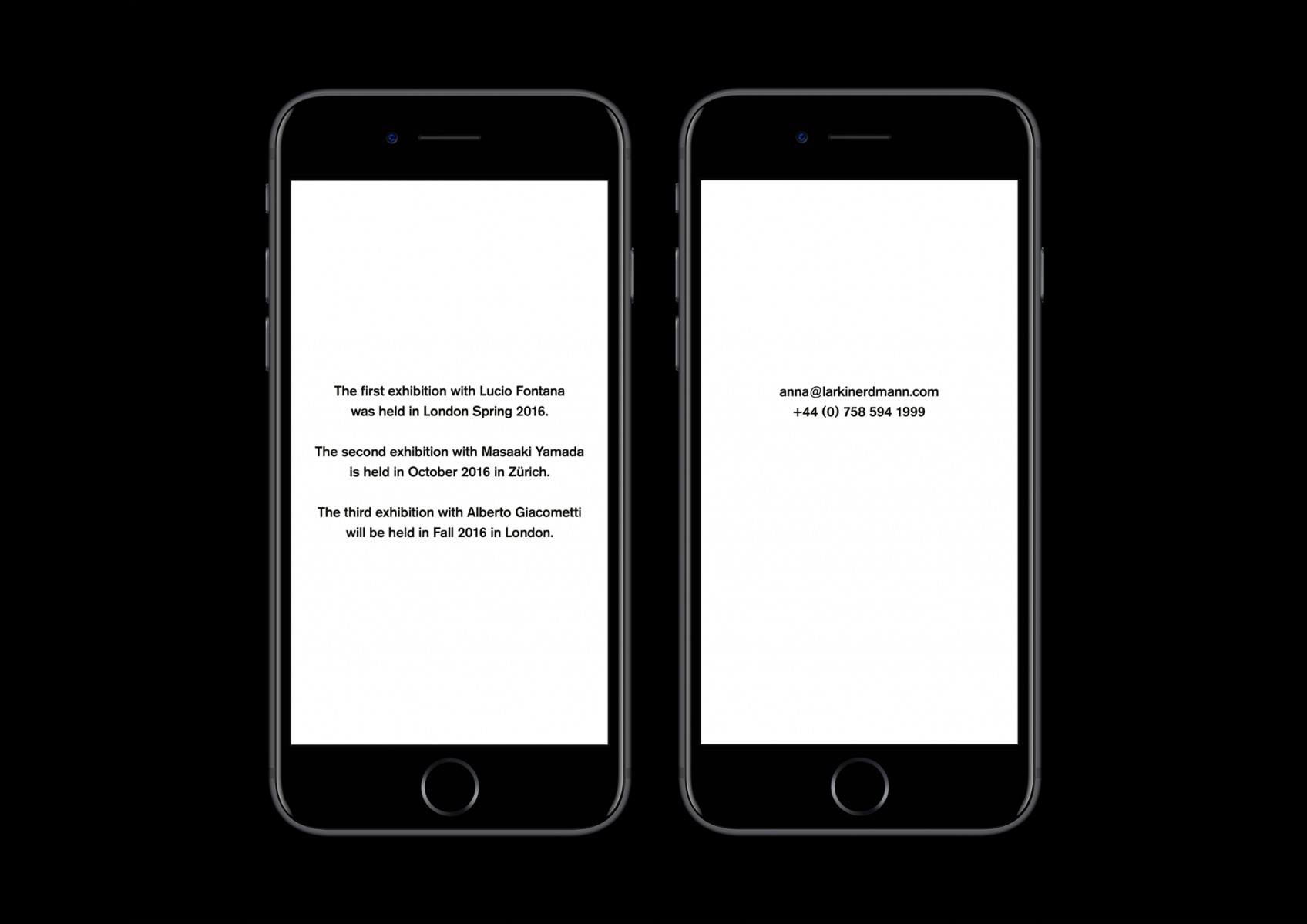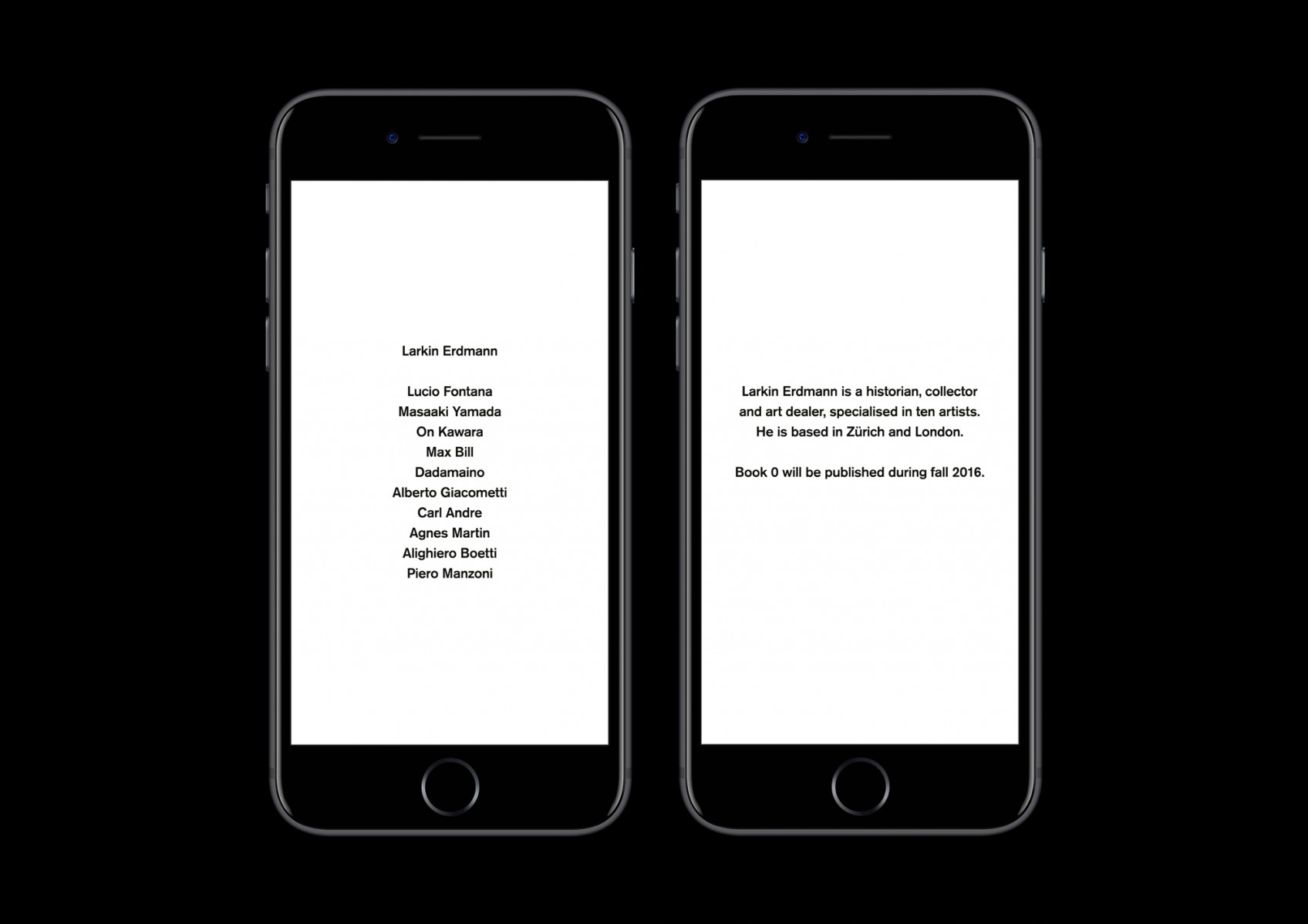 Hemsida på uppdrag av konsthandlaren Larkin Erdmann, baserad i London och Zürich, med verk av Carl Andre, Max Bill, Alighiero Boetti, Dadamaino, Lucio Fontana, Alberto Giacometti, On Kawara, Piero Manzoni, Agnes Martin och Masaaki Yamada. (2016–17)