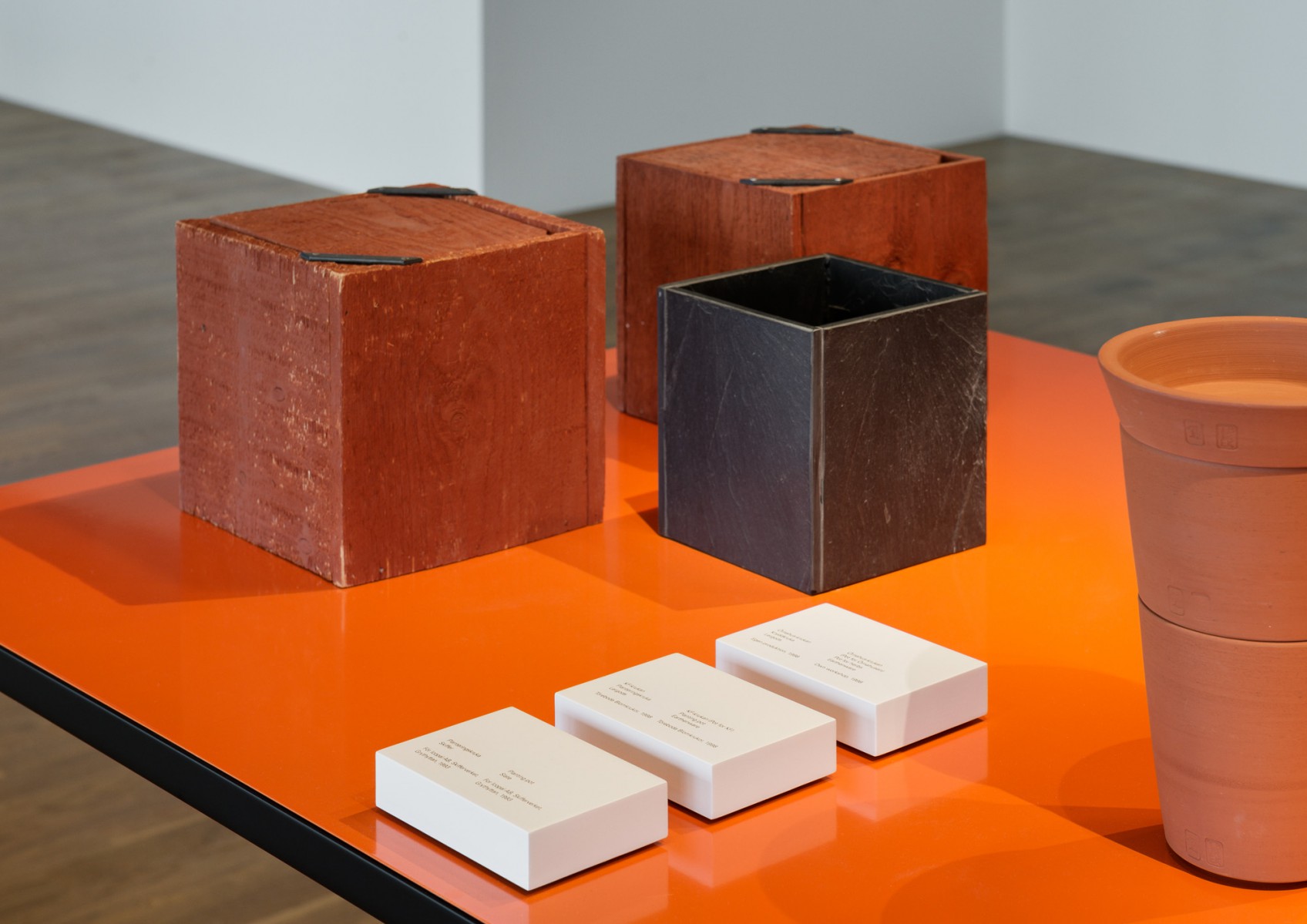 Stansade och limmade, 123x304x123 samt 225x123x123 mm. Boktryckt guldetikett inklistrad på locket. I samarbete med Vandalorum. (2015–16)