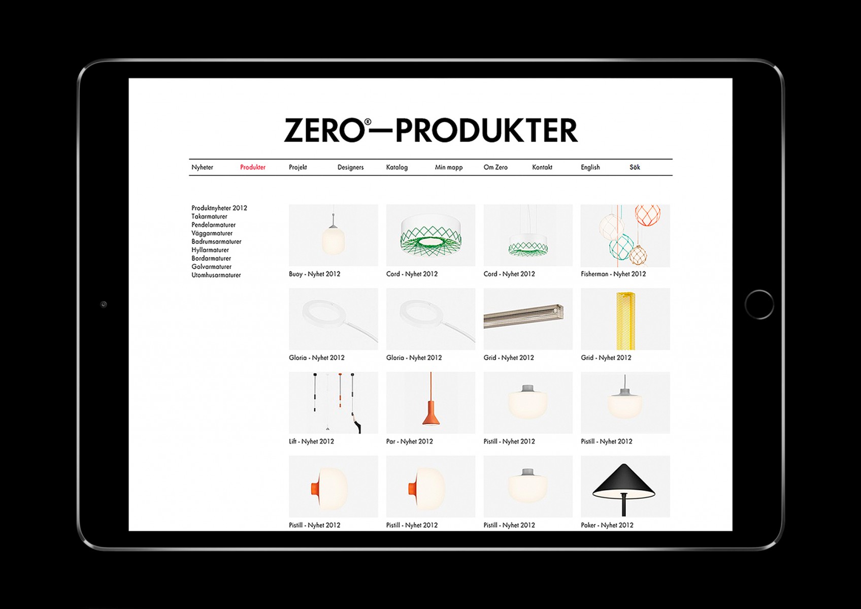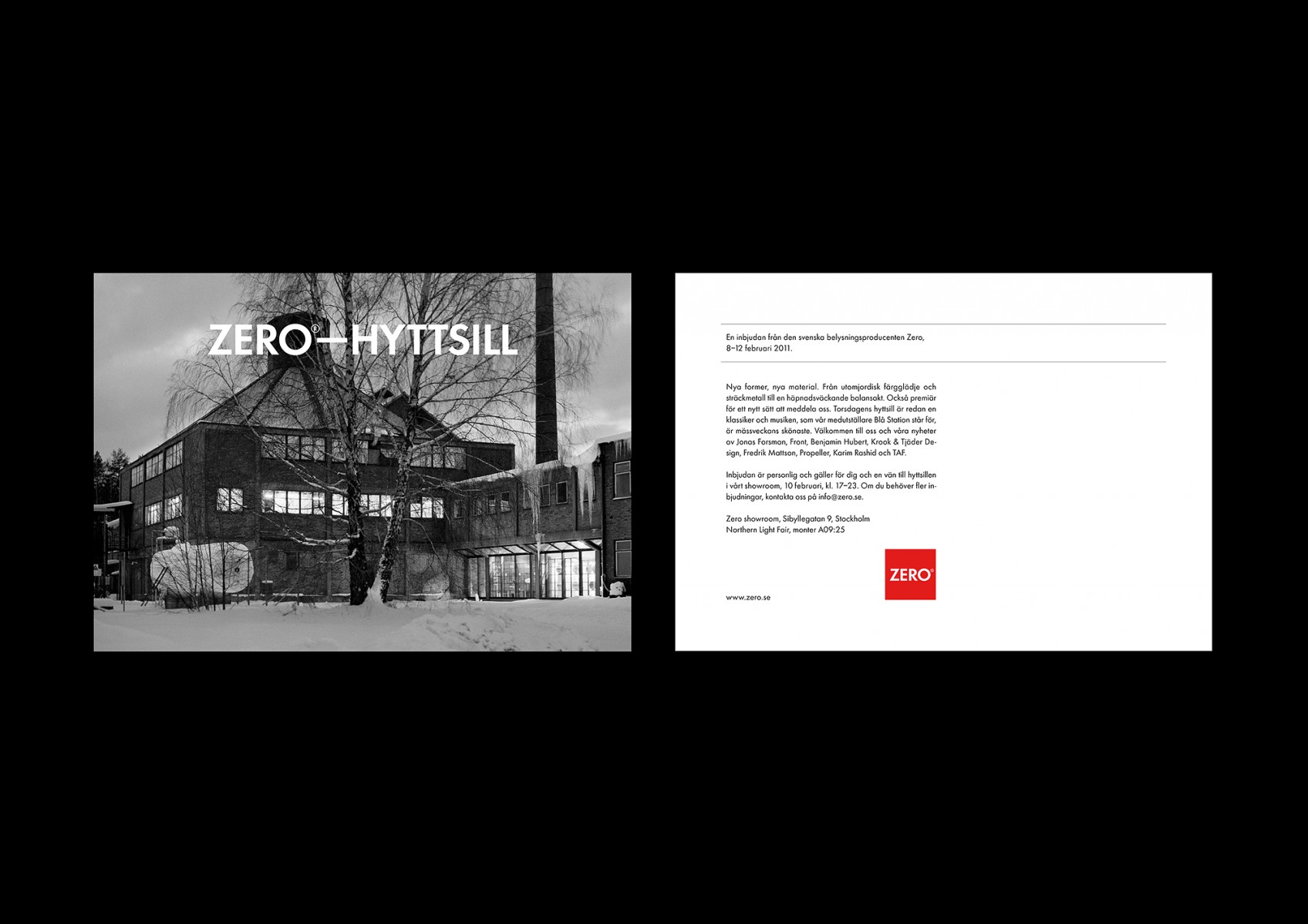 Identitet och hemsida för belysningsföretaget Zero. Uppdatering och översyn av logotype, typografi, mallar, text, fotografi (Jonas Lindström och Gerry Johansson) och teknisk produktion. Övergripande och löpande kommunikation samt produktion av hemsida, nyhetsbrev, annonser, inbjudningar, trycksaker, förpackningssystem, material till mässmontrar med m.m.